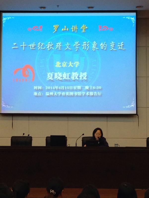 4月15日周二晚上6:30,温州大学育英图书馆二楼学术报告厅座无虚席,180多个座位的报告厅集聚了校内外近300名听众,可谓盛况空前。北京大学著名教授陈平原夏晓虹联袂做客罗山讲堂,分别讲演“中国大学西迁的历史及精神”和“二十世纪秋瑾文学形象的变迁”,副院长孙良好教授主持了本次活动。