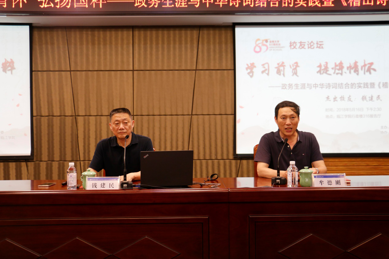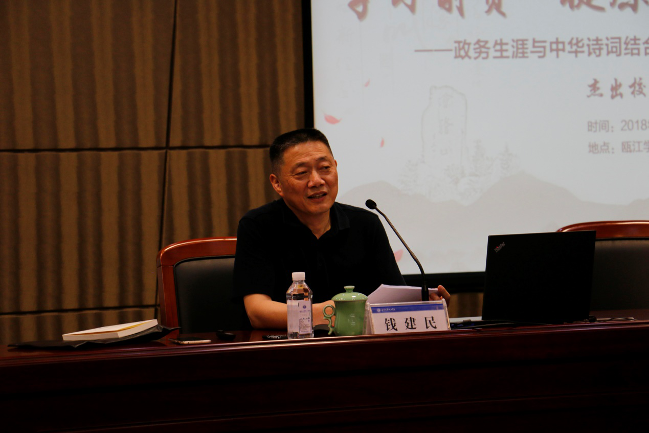 孔子云:诗三百,一言以蔽之,曰思无邪。2018年5月16日14:30,政务生涯与中华诗词结合的实践暨《稽山诗草》介绍学术讲座于我校瓯江学院行政楼316会议室如期举行。主讲人为浙江省人大常委会专职委员、第十二届全国人大代表,同时也是温州大学优秀校友钱建民先生。讲座由温州大学党委副书记牟德刚主持。