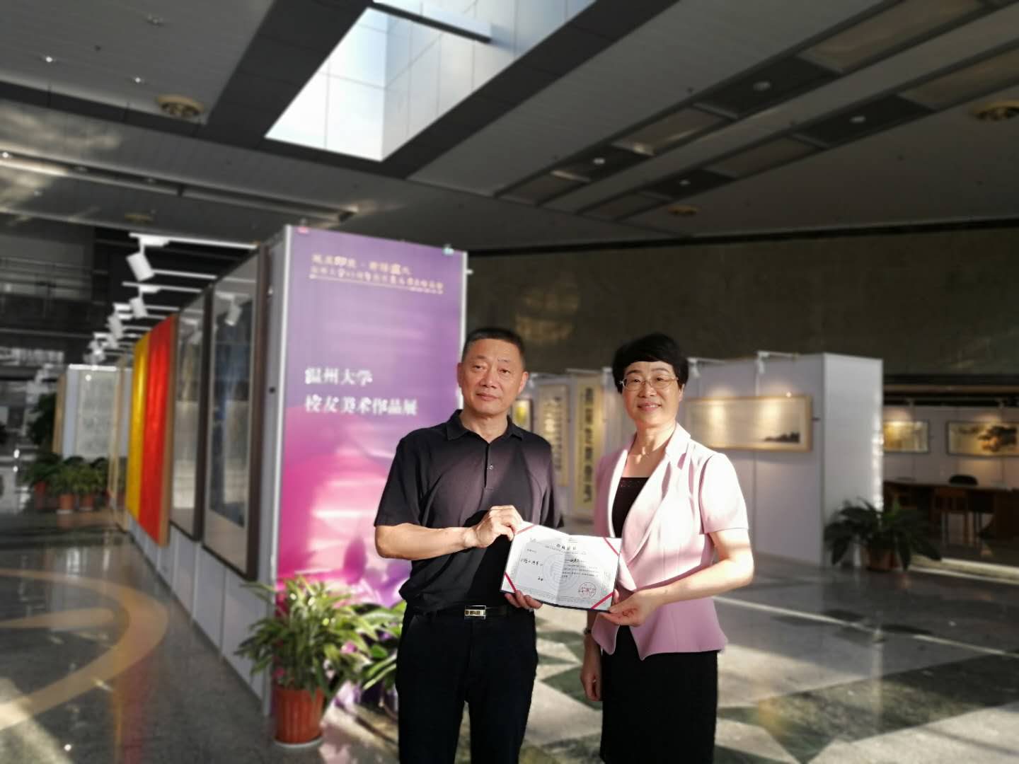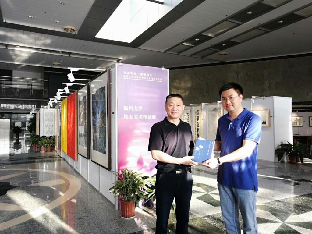 讲座结束后,温州大学党委书记林娟娟和球探体育 院长孙良好陪同钱建民先生去图书馆参观了温大校友美术作品展,林娟娟书记对钱先生向温大捐赠书籍表示感谢并为其颁发了捐赠证书,孙良好院长代表球探体育 向其赠书。