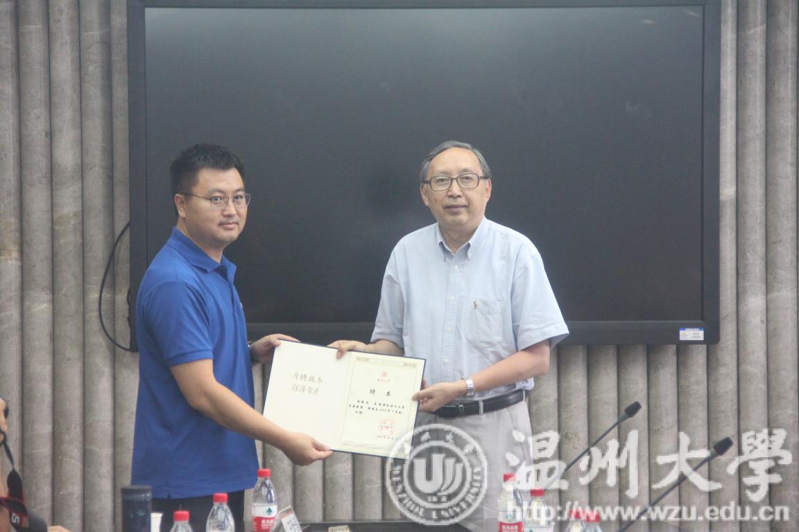 交流会在陈安金教授的介绍中拉开帷幕。陈教授首先对陈来教授及其夫人以及温州市朱子学派的诸位学者的到来表示热烈欢迎,紧接着简单地介绍了温州大学以及球探体育 的情况,希望陈来教授能够对球探体育 乃至温州大学的发展提出宝贵建议,特聘陈来教授为温州大学“名誉教授”。孙良好院长为陈来教授颁发了温州大学的聘书并合影留念。