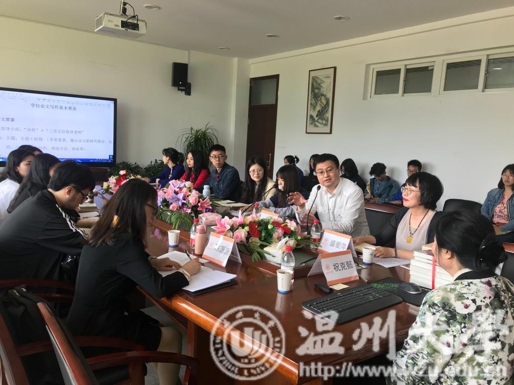 为扩展研究生学术视野,提高学术论文写作水平,2019年5月9日下午3时,温州大学人文学术沙龙系列之“学术论文写作方法探索”主题讲座在人文楼213会议室顺利开展。此次沙龙特邀复旦大学祝克懿教授主讲,由球探体育 盛爱萍教授主持,孙良好院长出席,陈源源老师和李爱红老师也参加了此次讲座。现场学术氛围浓厚,师生们认真聆听,深刻讨论。