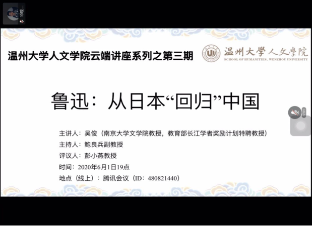6月1日晚7点,球探体育 云端讲座第三场在腾讯会议如期举行。这次讲座开讲嘉宾是南京大学文学院、教育部长江学者吴俊教授,他的讲座题目是《“鲁迅:从日本“回归”中国——鲁迅与夏目漱石”》。