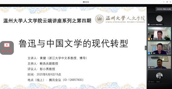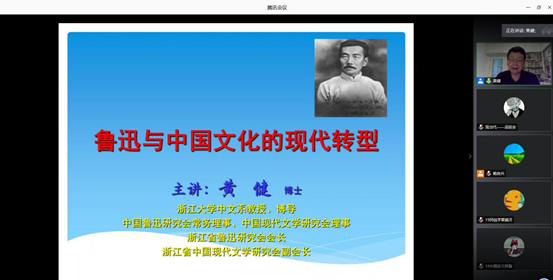 6月8日晚7点,球探体育 云端讲座第四场在腾讯会议如期举行。浙江大学中文系黄健教授作了题为“鲁迅与中国文学的现代转型”的报告,此次讲座由孙良好院长、鲍良兵老师主持。