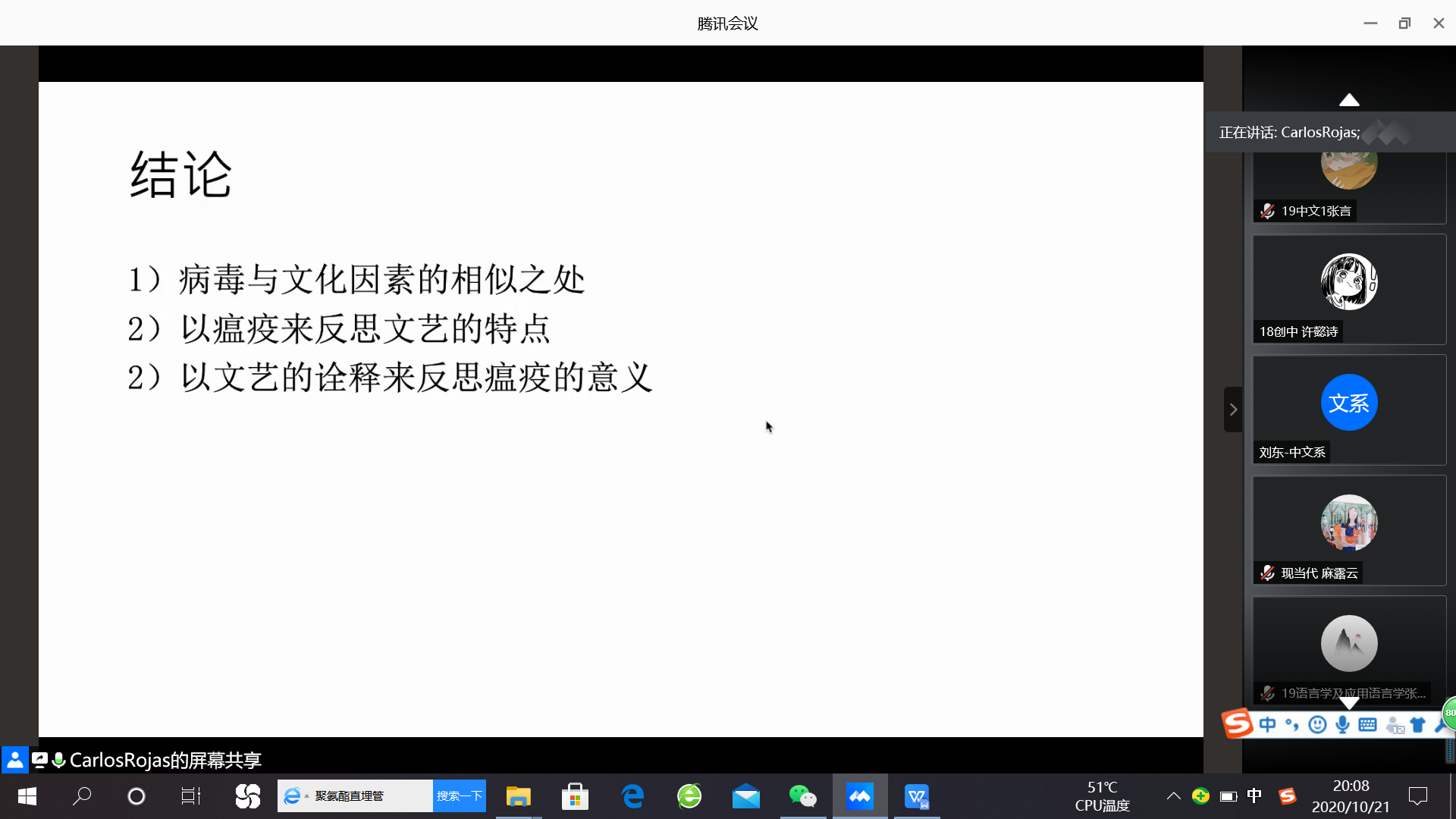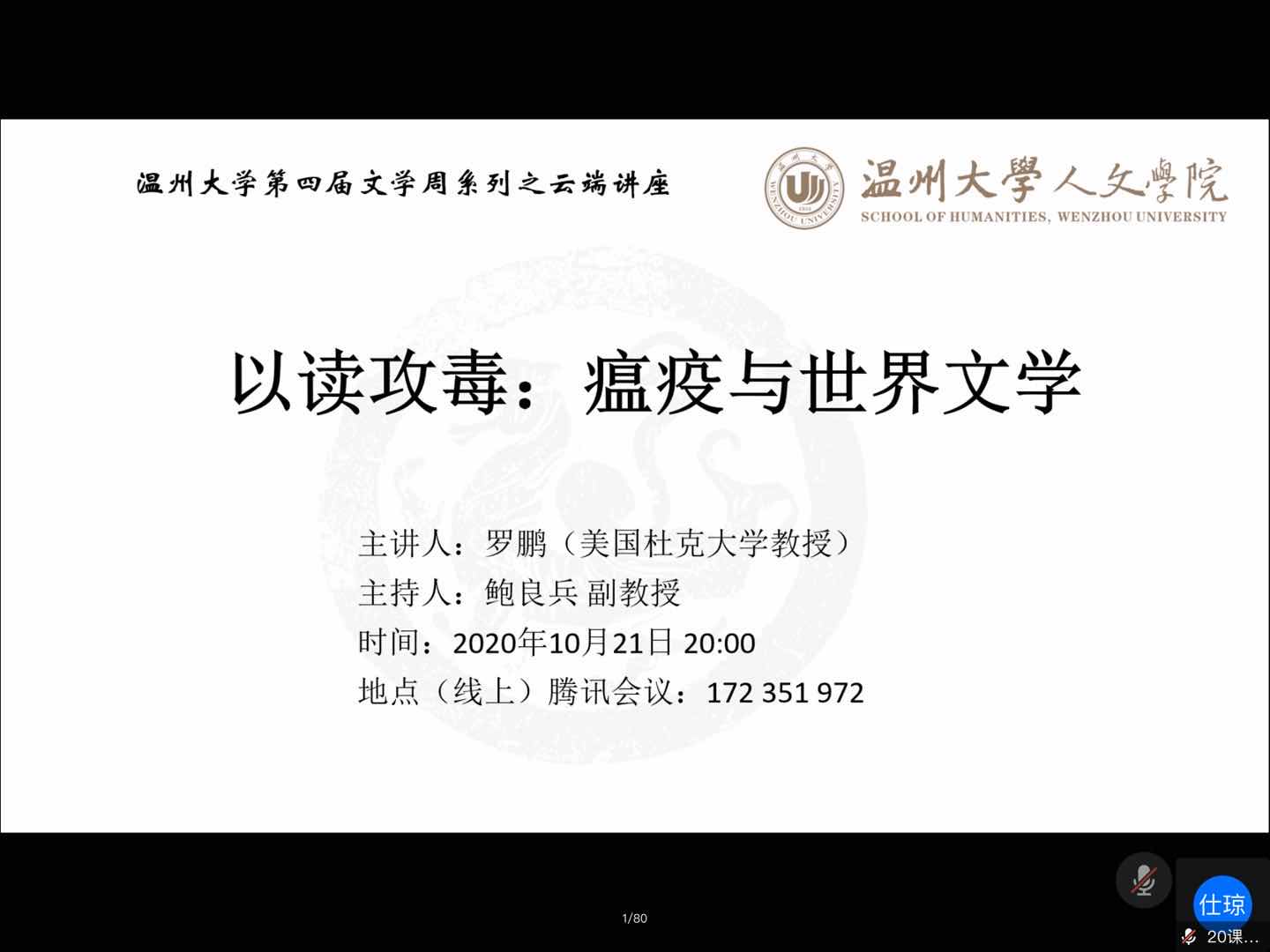 会议开始,在鲍良兵副教授进行大致介绍后,罗鹏教授感谢了老师的邀请,并对不能来温大表示遗憾,随后解释了会议主题“以读攻毒”的含义,他将自身的免疫反应看作是“误读”的后果,并用“阅读”和“误读”来反思“瘟疫”和“文艺”之间的关系,分别从瘟疫和文艺、阅读和误读、免疫反应和自身免疫反应这三个方面进行讨论。