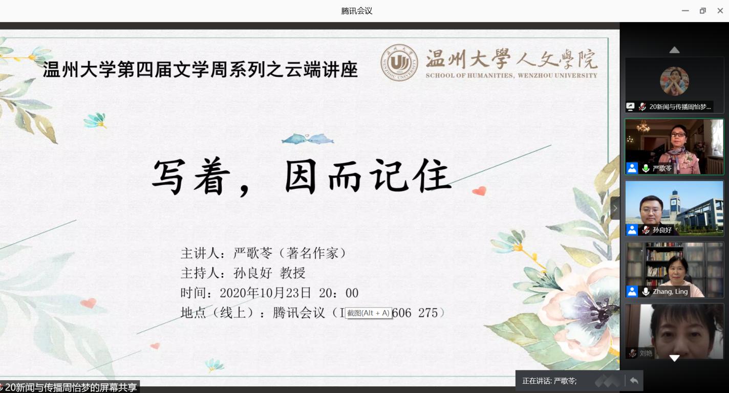 2020年10月23日20:00,温州大学第四届文学周之云端讲座《写着,因而记住》准时在腾讯会议举行。本次云端论坛受邀嘉宾分别是著名作家严歌苓、著名海外华文作家张翎以及中国社会科学院文学研究所的刘艳博士。本次云端论坛由孙良好院长主持,除文学专业外,各专业研究生和本科生也广泛参与。