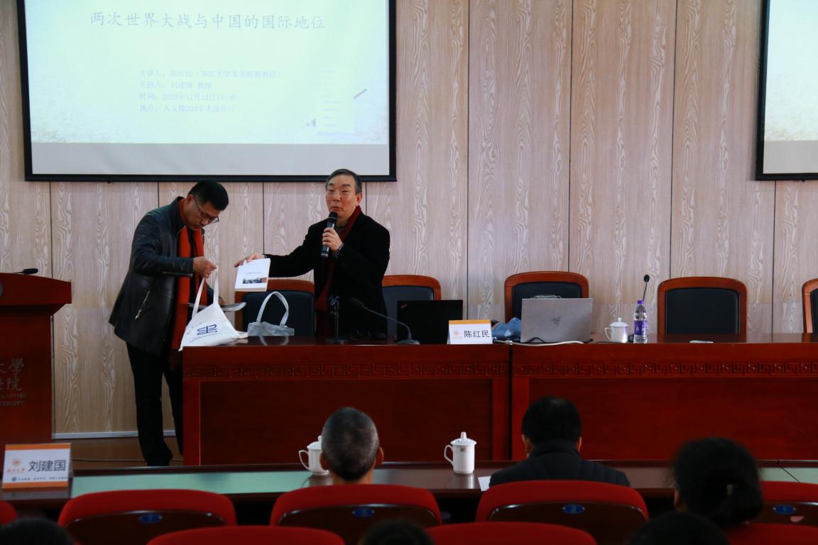 讲座伊始,球探体育 刘建国教授对陈红民教授作了简要介绍,而后陈红民教授向学院赠送了《蒋介石的后半生》《什么是最好的历史学》等著作、论文集以及自制蒋介石与近现代中国研究中心十周年纪念册等。