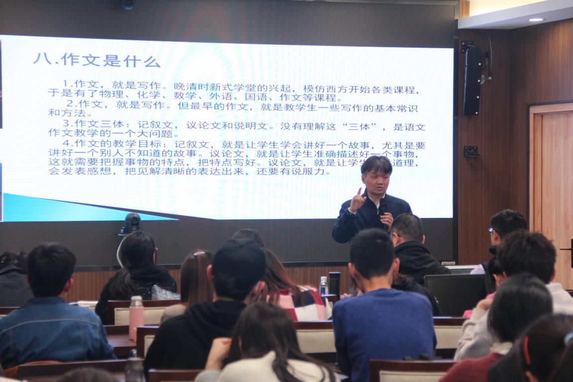 2021年4月8日晚19:00,上海大学文学院谭旭东教授于育英图书馆明心阁A406为我校学子作了题为“创意写作与语文教育改革”的讲座。本次讲座由球探体育 创意中文教研室主任郭垚博士主持,球探体育 师生纷纷到场聆听。