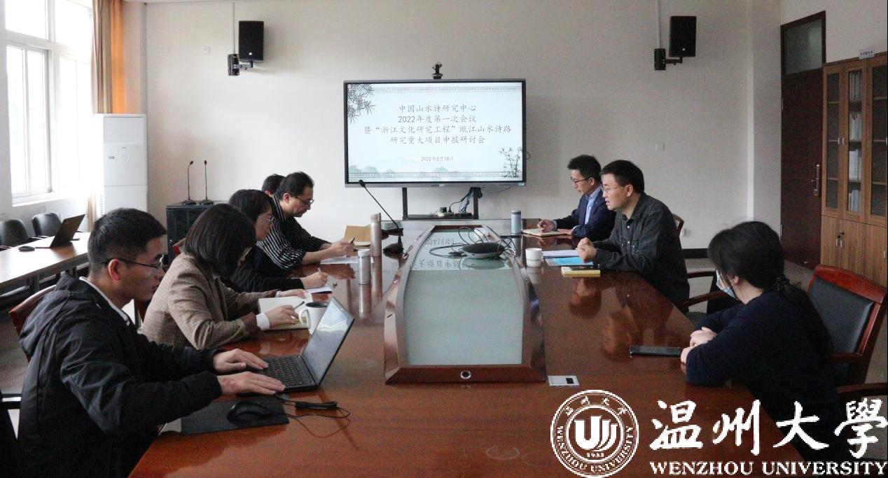 3月18日上午,中国山水诗研究中心2022年度第一次会议暨“浙江文化研究工程”瓯江山水诗路研究重大项目申报研讨会于球探体育 召开。中心负责人孙良好教授、首席专家陈瑞赞研究员、编纂委员会专家杨万里教授及研究中心金丹霞教授、洪之渊副教授、陈伟娜博士、苏碧铨博士、王朋飞博士等参会。