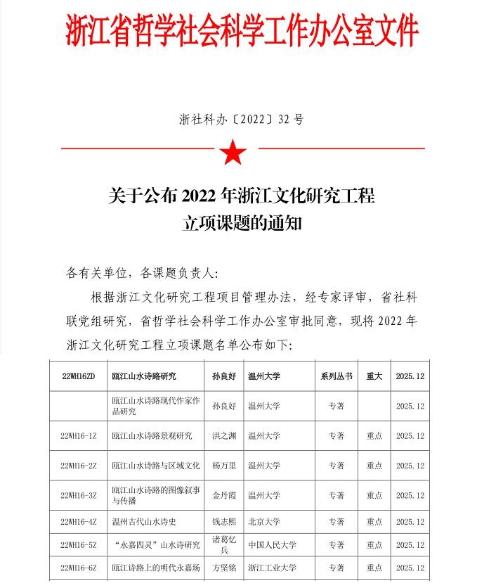 孙良好教授宣布中心课题“瓯江山水诗路研究”已被立项为浙江省文化研究工程重大项目。该项目分为“瓯江山水诗路现代作家作品研究”“瓯江山水诗路景观研究”“瓯江山水诗路与区域文化”“瓯江山水诗路的图像叙事与传播”“温州古代山水诗史”“‘永嘉四灵’山水诗研究”“瓯江诗路上的明代永嘉场”等子课题,分别由孙良好教授、洪之渊副教授、杨万里教授、金丹霞教授、钱志熙教授、诸葛忆兵教授、方坚铭教授主持。孙教授指出重大课题立项是全体成员共同努力的结果,也是中心发展的重要推手,强调中心成员要尽早开展相关工作,为下一步申报国家社会科学基金重大项目打下扎实基础。