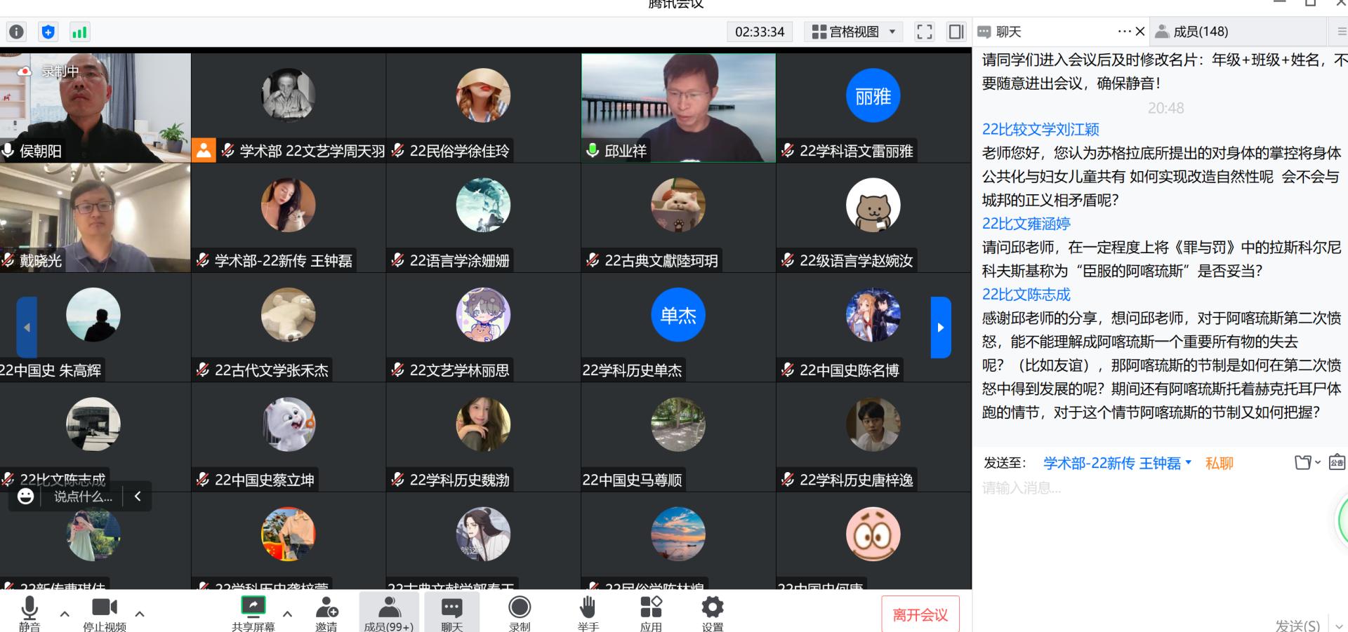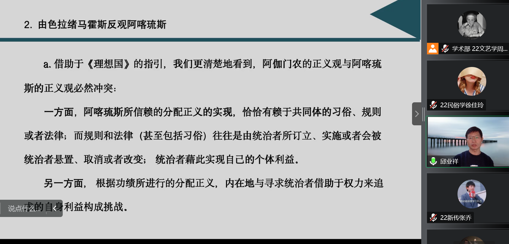 2022年11月4日19点,河南大学文学院教授、博士生导师邱业祥老师受邀为球探体育 师生带来了一场题为“苏格拉底论阿喀琉斯——以《理想国》为中心”的精彩讲座。讲座由侯朝阳老师主持,中国人民大学文学院青年教师戴晓光博士参与对谈。