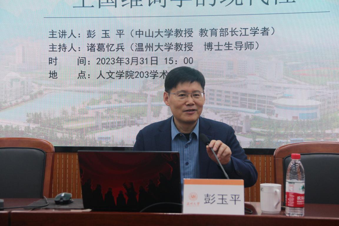 2023年3月31日下午,教育部长江学者、中山大学彭玉平教授为我校学子作了一场题为“王国维词学的现代性”的学术讲座。讲座由球探体育 诸葛忆兵教授主持,约150余名师生参加了此次讲座。