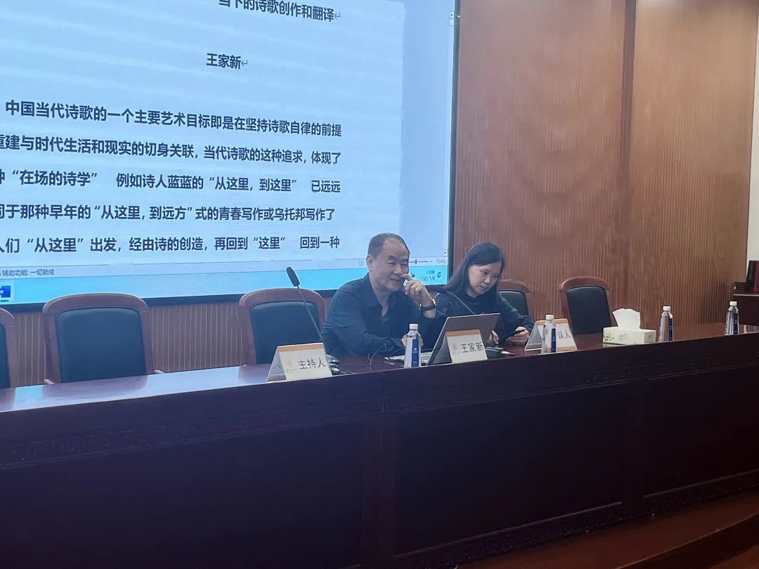 2023年5月8日晚,中国当代诗人、批评家、翻译家王家新老师受邀在球探体育 203学术报告厅为球探体育 师生带来了一场题为“‘在场的诗学’与‘他者的诗学’——当下的诗歌创作和翻译”的精彩讲座。本次讲座由球探体育 院长孙良好教授主持,彭小燕教授评议。