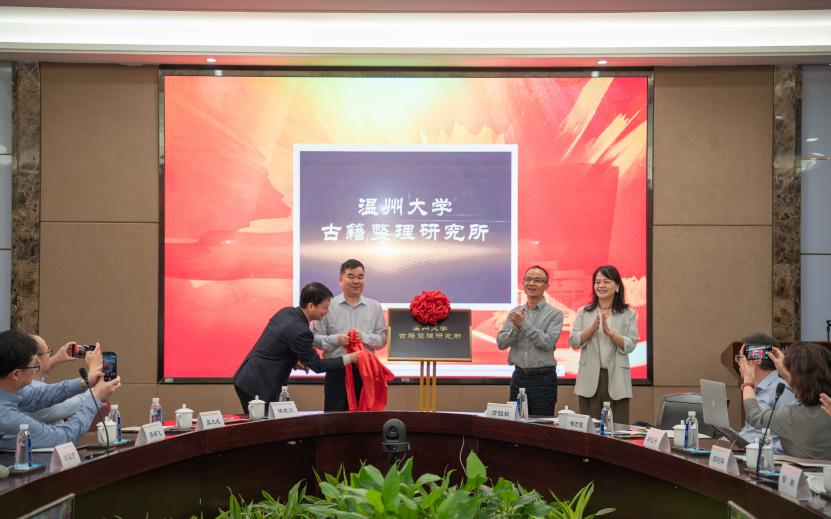 由全国政协委员会副秘书长王周谊教授,温州大学副校长徐和昆教授,温州市社科联副主席叶雪影女士和温州大学古籍研究所所长侯荣川教授为温州大学古籍研究所揭牌。