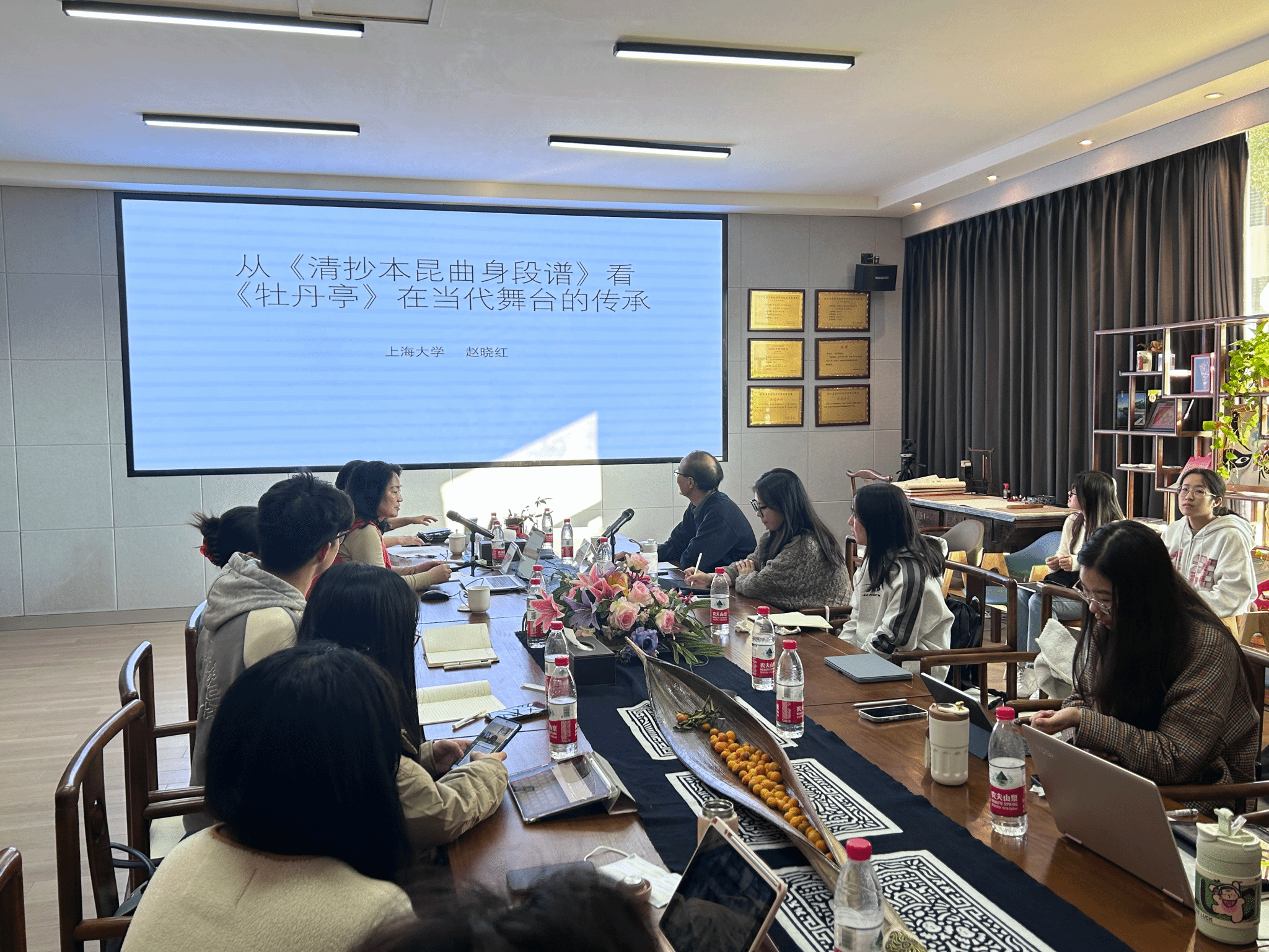 最后,赵晓红教授根据《寻梦》一出的演出轨迹与审美焦点,指出《寻梦》在乾隆早期乃至更早的康雍时期就已经开始为世人所喜爱,当时文人对于其关注的重点主要在曲学方面。此外,还给大家播放了姚传芗和张继青两者的杜丽娘版本进行对比,用舞台视频来讲解身段谱的详细内容,强调身段是剧情,和单纯的舞蹈是不一样的。