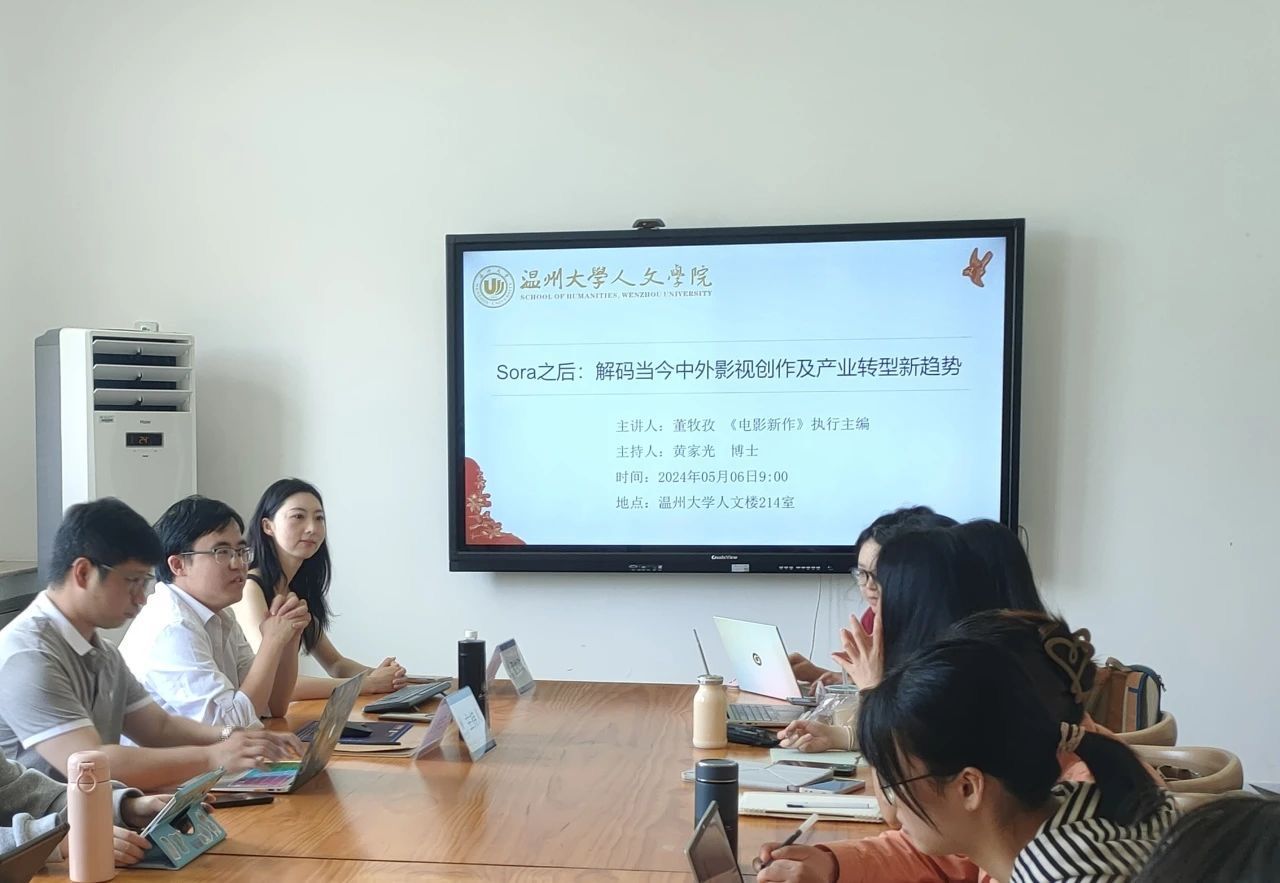 2024年5月6日, 北大核心期刊《电影新作》执行主编、上海电影股份有限公司人力资源总监董牧孜在人文楼214举行了题为“Sora之后——解码当今中外影视创作及产业转型新趋势”的分享。讲座由球探体育 黄家光博士主持,李广旭博士及相关专业学生聆听了此次讲座。