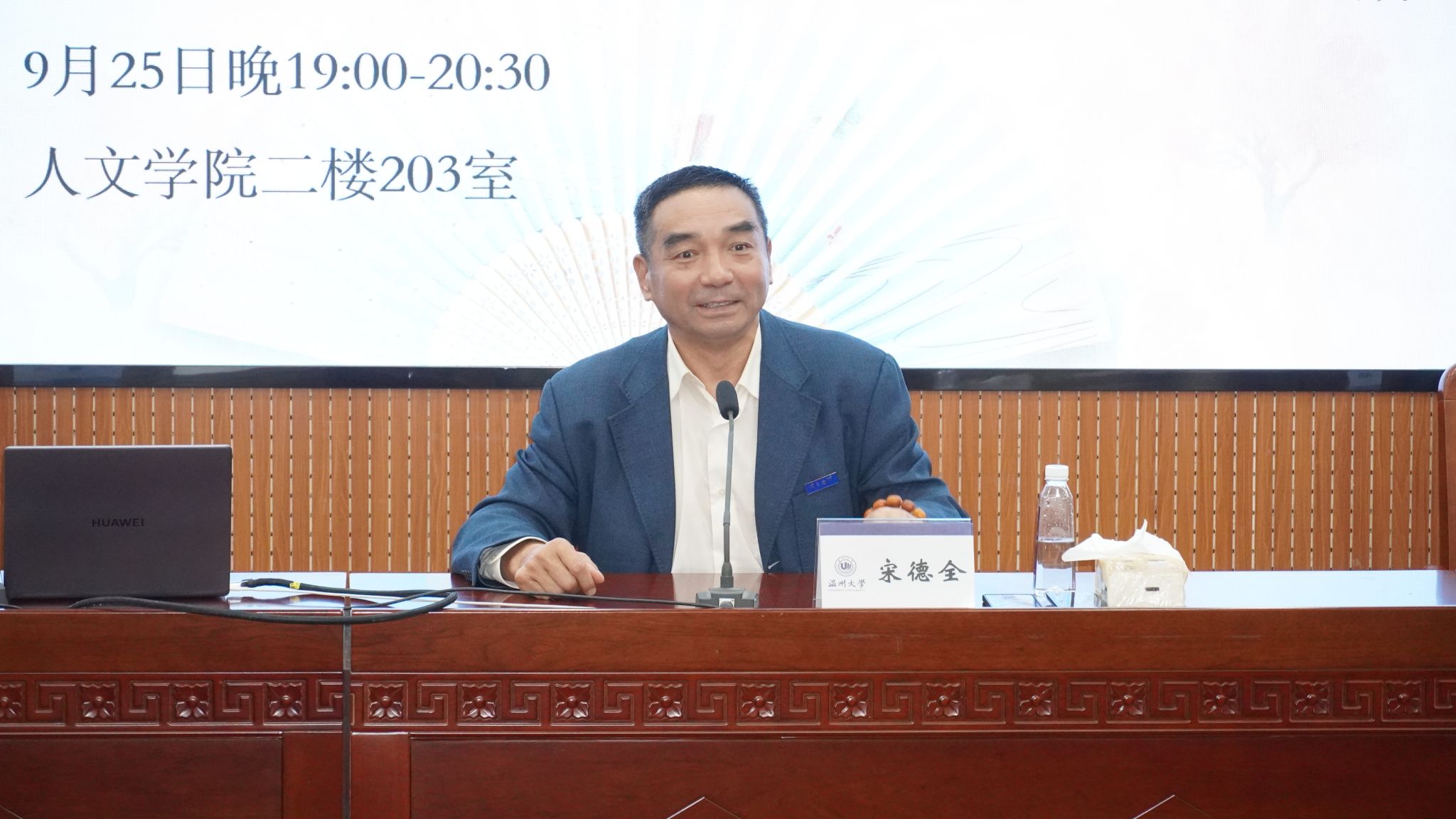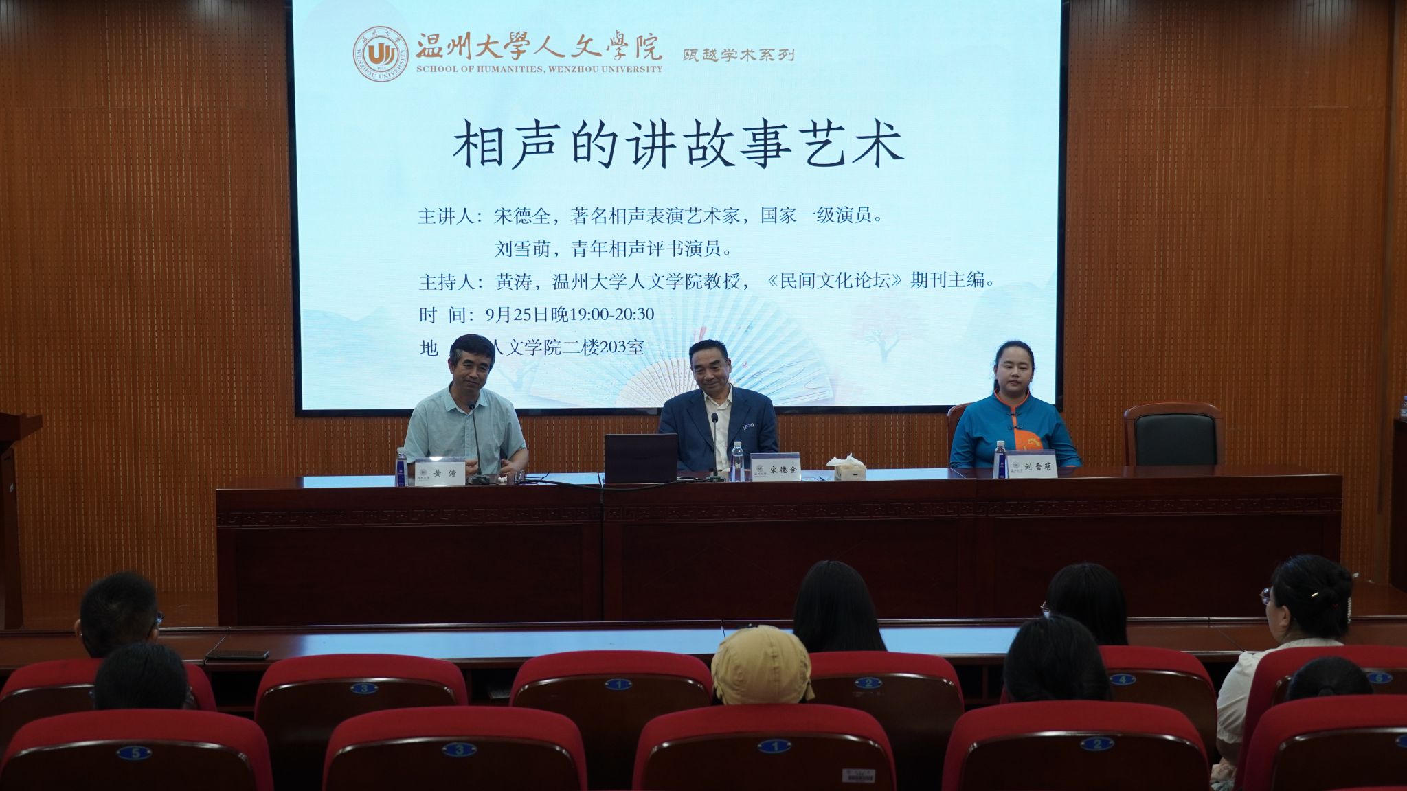 2024年9月25日晚,著名相声表演艺术家,国家一级演员,宋德全先生和青年相声评书演员刘雪萌女士,应温州大学球探体育 、温州民俗博物馆邀请,在球探体育 203学术报告厅,作了一场题为“相声的讲故事艺术”的学术讲座。本次讲座由黄涛教授主持,程安霞老师、王辉老师,温州市委党校胡正裕老师出席,球探体育 各专业研究生、本科生积极参加。