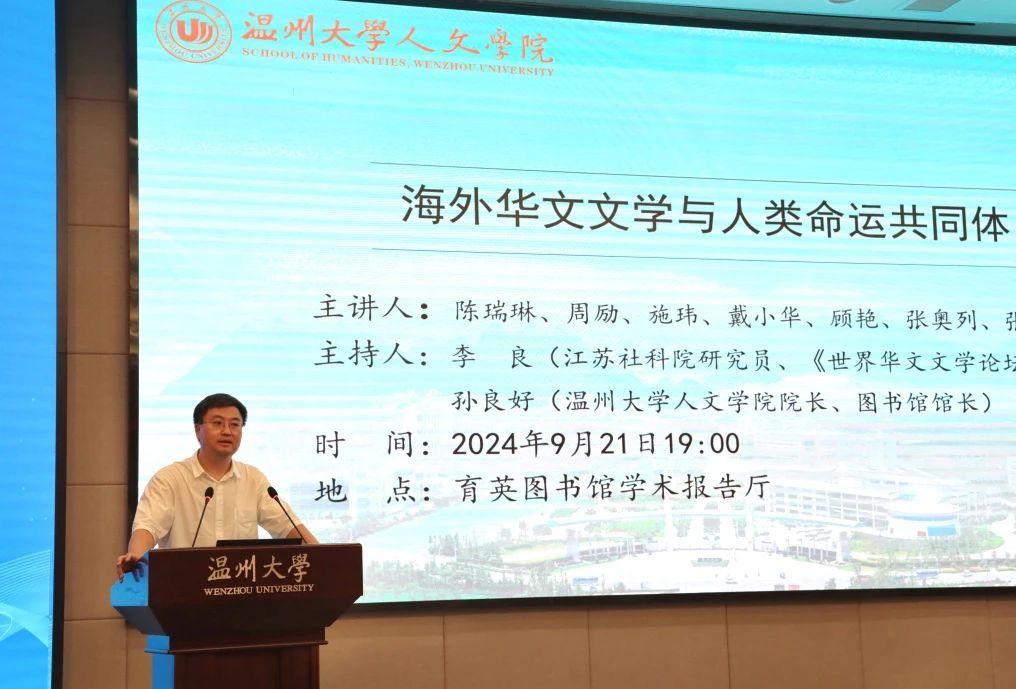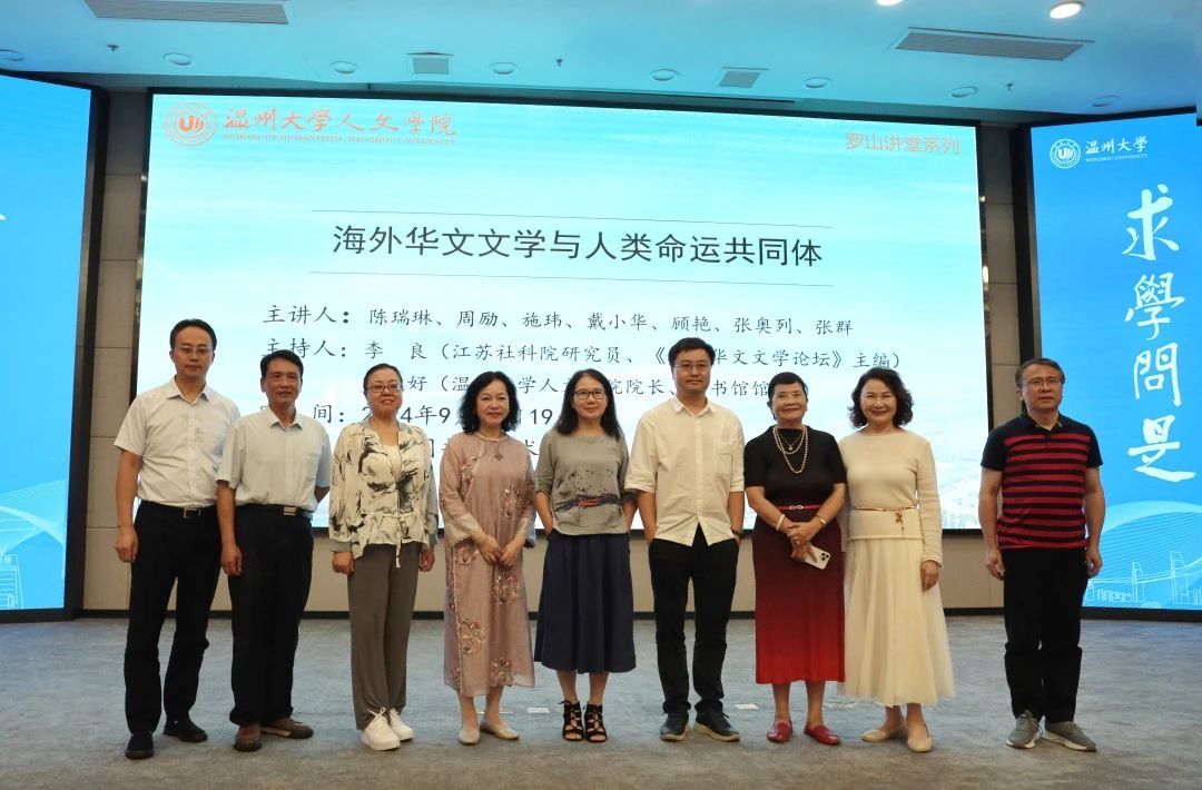 2024年9月21日晚,七位知名海外华文作家陈瑞琳、周励、施玮、戴小华、顾艳、张奥列、张群在我校育英图书馆学术报告厅作了一场题为“海外华文文学与人类命运共同体”的精彩讲座。此次讲座由球探体育 院长、图书馆馆长孙良好教授和江苏省社会科学院研究员、《世界华文文学论坛》主编李良共同主持。
