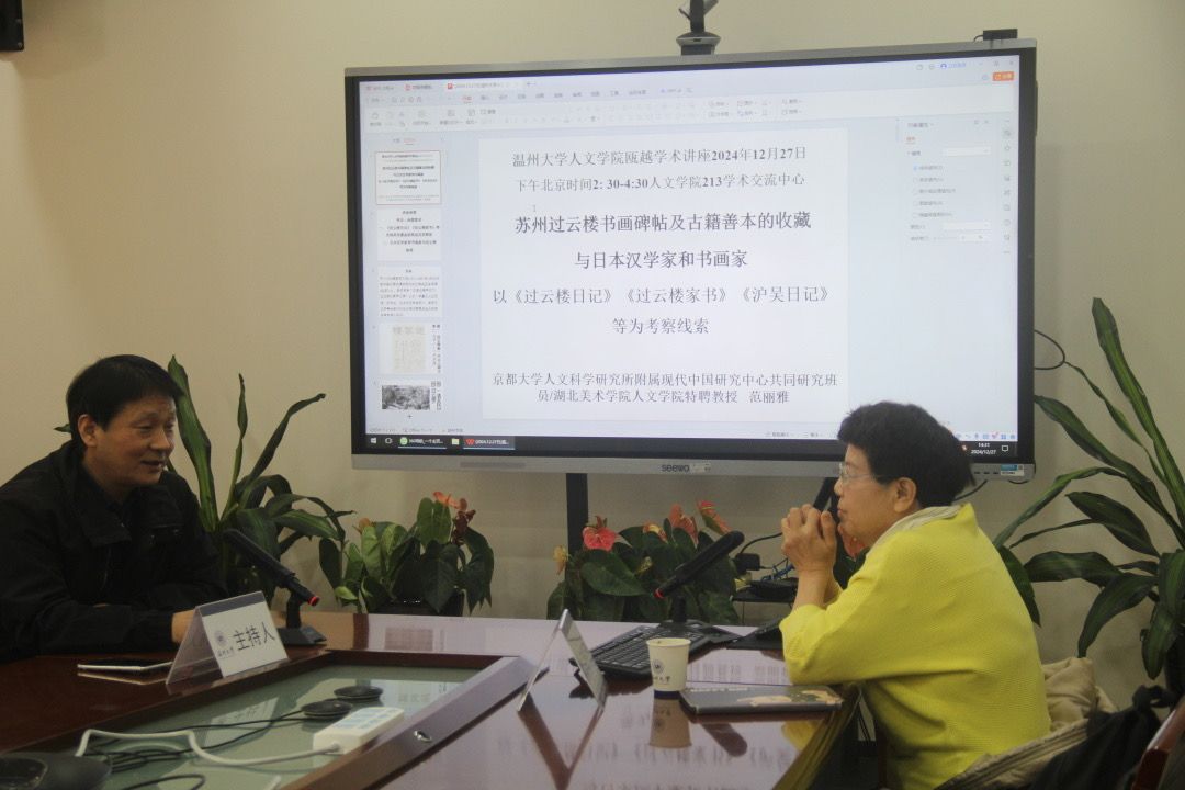 2024年12月27日下午,京都大学人文科学研究所附属现代中国研究中心共同研究班员范丽雅教授应邀在球探体育 213学术交流中心作了题为《苏州过云楼书画碑帖及善本古籍的收藏与日本汉学家和书画家》的学术讲座。本次讲座由我校古籍整理研究所所长侯荣川教授主持,30余师生积极到场参加。