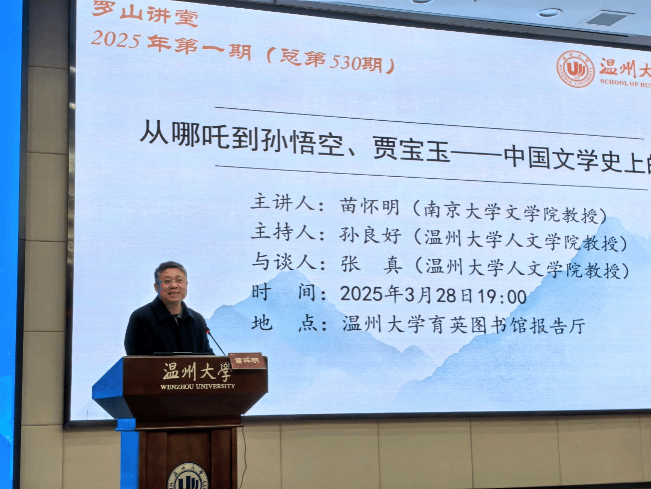 2025年3月28日,南京大学文学院教授苗怀明教授应邀在我校育英图书馆报告厅,作了一场题为“从哪吒到孙悟空、贾宝玉——中国文学史上的反骨仔”的专题讲座。本次讲座由孙良好教授主持,张真教授参与探讨。本次讲座吸引了校内外百余名师生前来聆听。