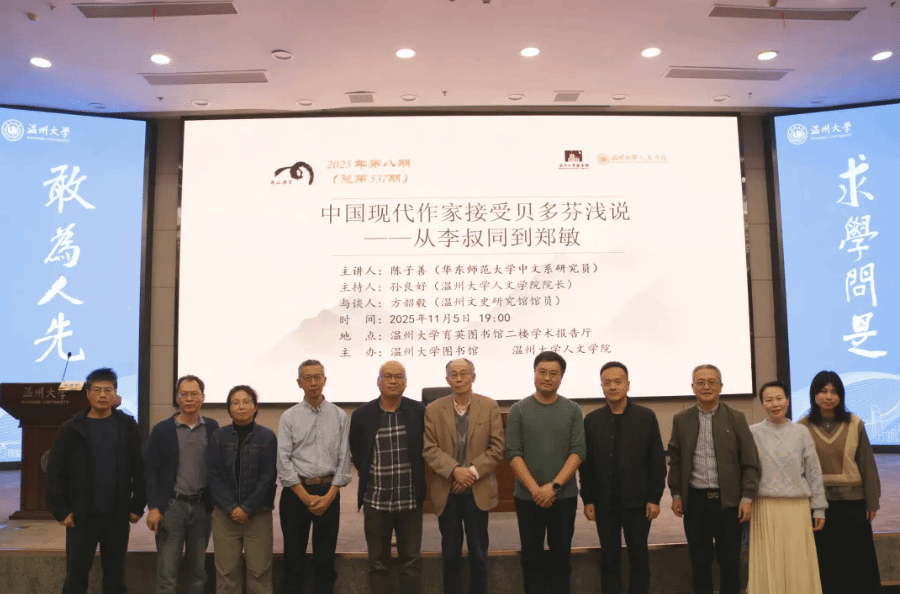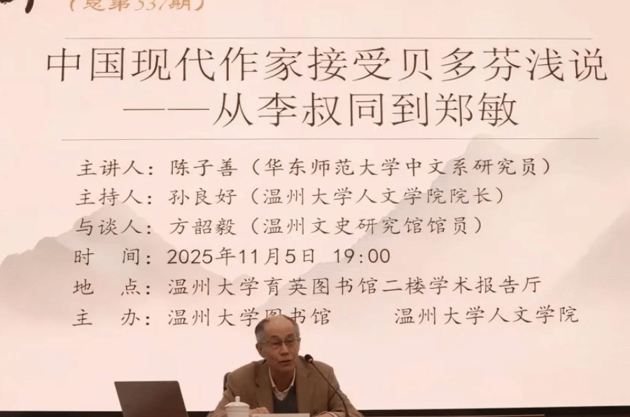 2025年11月5日晚,华中师范大学中文系研究员陈子善教授应邀在温州大学育英图书馆学术报告厅,作了一场题为“中国现代作家接受贝多芬浅说——从李叔同到郑敏”的专题讲座。本次讲座由温州大学球探体育 院长、图书馆馆长孙良好教授主持,温州文史研究馆馆员方韶毅与球探体育 教授陈文辉参与探讨。现场师生踊跃参与交流,共赴这场学术盛宴。