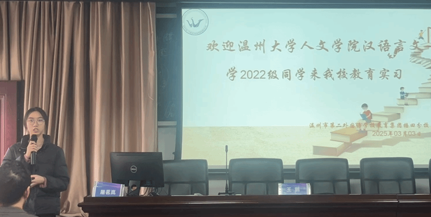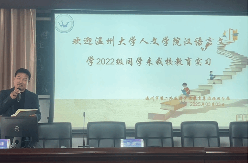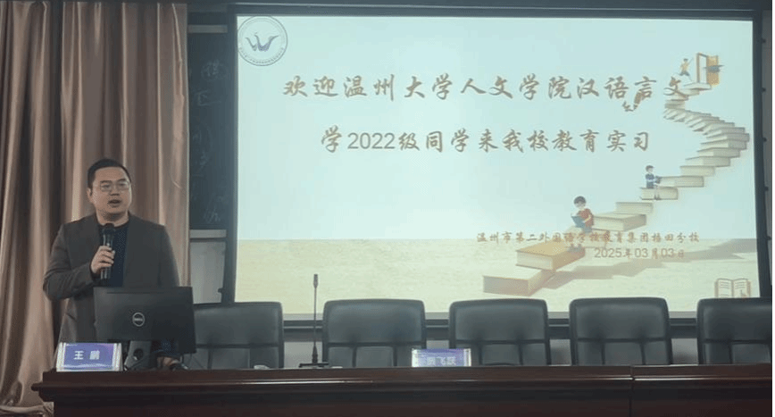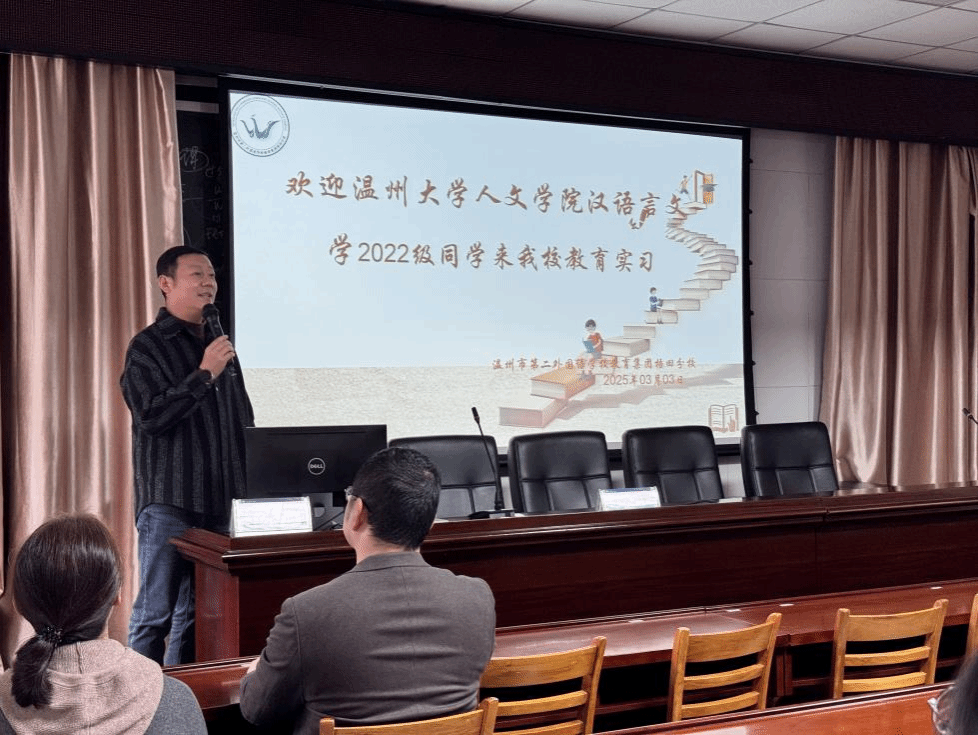 三月,万物复苏,春天一点一点地化开。在这个充满生命的季节里,22中文1班的8位同学迎来了将理论转化为实践的锻炼机会。2025年3月3日,在温州市第二外国语学校教育集团梧田分校与温州大学球探体育 汉语言文学(师范)专业2022级学生教育实习工作启动仪式在温州市第二外国语学校教育集团梧田分校南二楼教师会议室举行。见面会由温州市第二外国语学校教育集团梧田分校教学科研处主任金红蕾老师主持,参与本次见面会的人员有温州大学球探体育 的王鹏副院长、陈柳老师和温州市第二外国语学校教育集团梧田分校校长贾飞跃、副校长陈荣建、指导老师们和全体实习生。