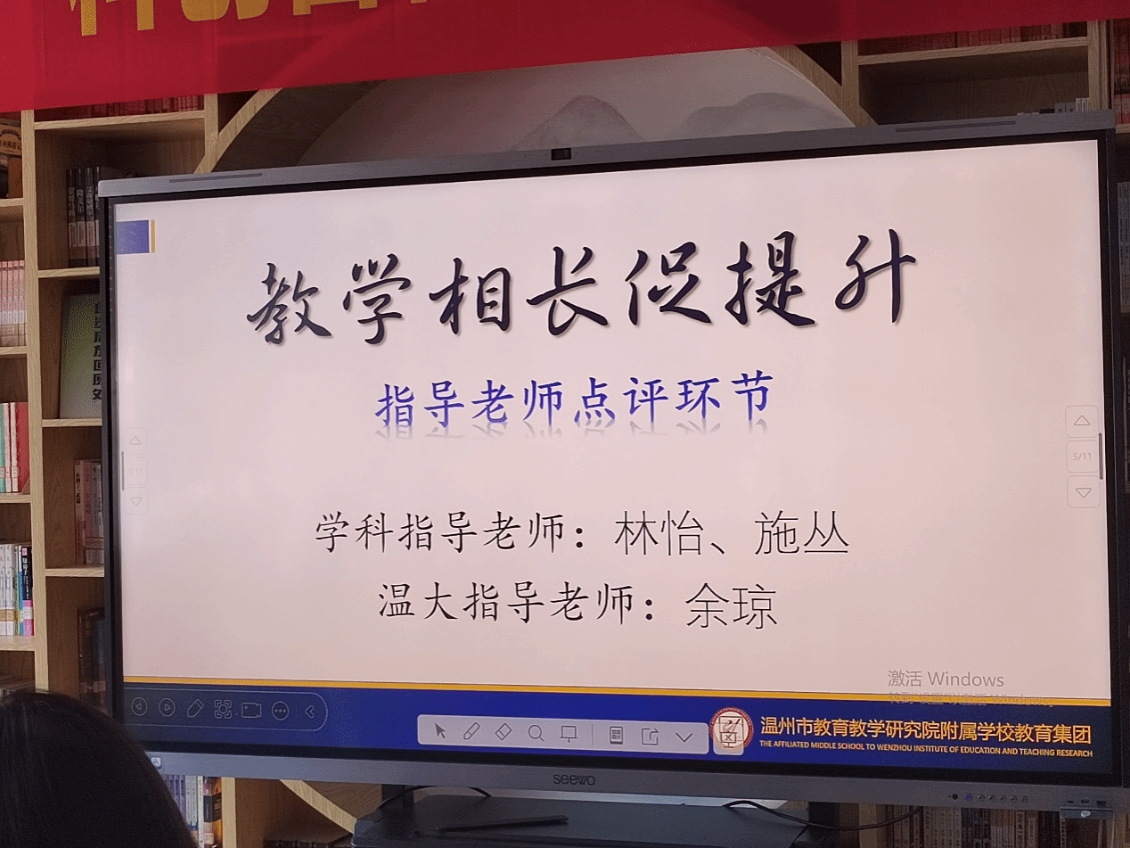 在指导老师点评环节,学科指导师胡尔倩、林怡老师以及高校导师余琼老师分别对两位同学的汇报课做了点评。胡老师认为阮佳晞的课堂有情境意识和引导意识,带着学生从不同切入去思考的教学方式对学生思维的训练有帮助。林老师认为许颖雪的教学环节推进流畅,由文本到思辨再到形象感知的层级提升,符合综合素养的核心关照;课堂设计安排了演绎的环节,非常适合提升学生的活跃度,并在其中加入了跨学科元素。余老师充分肯定了两位同学的汇报课,体现了“以生为本”的核心要求,同时指出课堂需留有弹性,增强即时反馈。