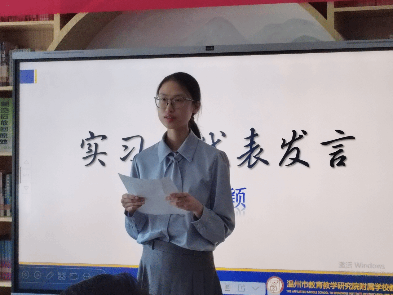 随后,实习生代表缪泓颖同学发言。她代表全体实习生向温十二中表达真挚的感谢,感谢十二中提供宝贵的实习机会,尤其感谢实习指导师们的悉心指导。她表示,通过此次实习,实习生们在语文教学、班主任工作、校园活动中都收获满满,并对十二中今后的发展送出衷心的祝福。