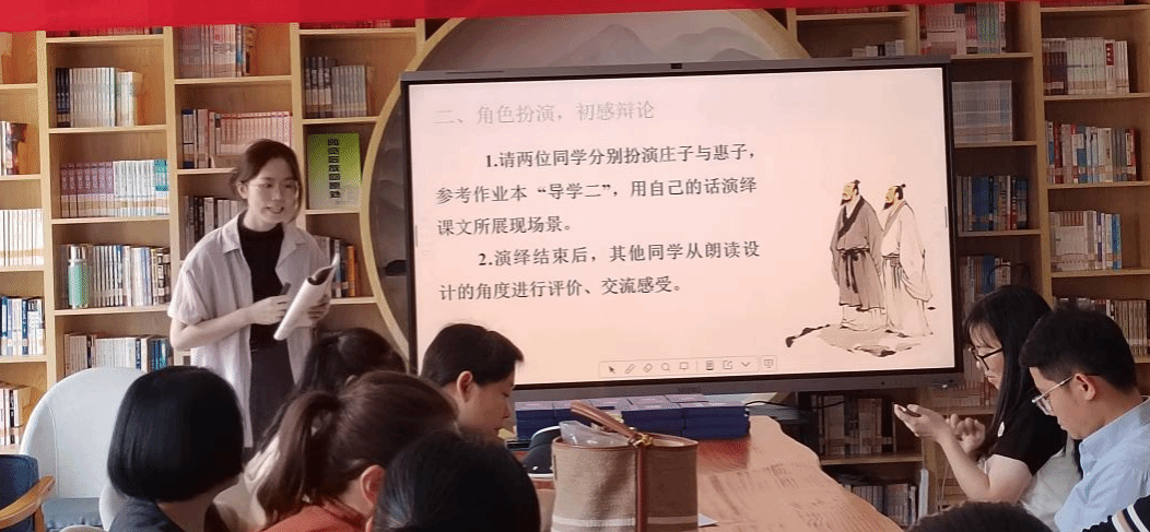 本次欢送会由实习汇报课为开场。实习生代表阮佳晞、许颖雪以模拟上课的形式,分别带来《时间的脚印》《庄子与惠子游于濠梁之上》这两篇课文的精彩授课。阮佳晞同学以创造情境导入,以“为科考成果册取标题”的任务带动学生探讨课文标题的深刻含义,同时补充拓展资料,引导学生思考人与自然的关系。许颖雪同学以课前回顾导入,通过角色扮演、语段朗诵、小组讨论等形式,帮助学生理解惠子和庄子辩论过程中“以子之矛攻子之盾”和“偷换概念”辩论技巧,引导学生理解庄子与惠子的不同形象。