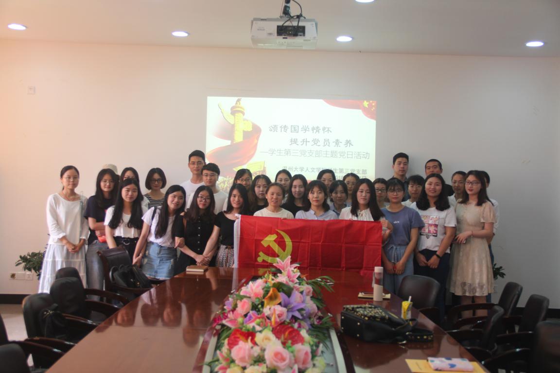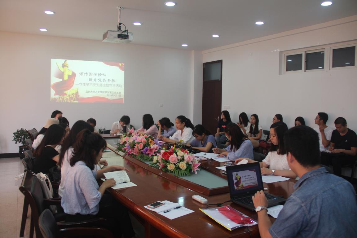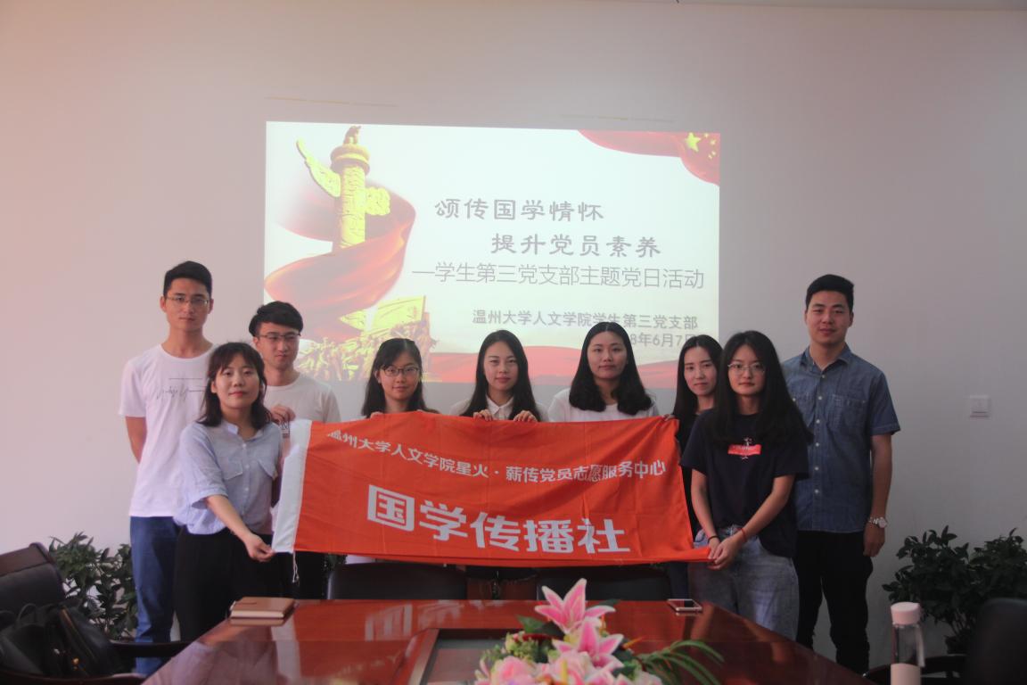 2018年6月7日上午,球探体育 学生第三党支部携手国学传播社在人文楼213会议室成功开展了“颂传国学经典 提升党性修养”主题党日活动。本次活动由学生第三党支部书记徐珍组织安排,学生第三党支部全体学生党员共同参与其中,并作了分享交流。