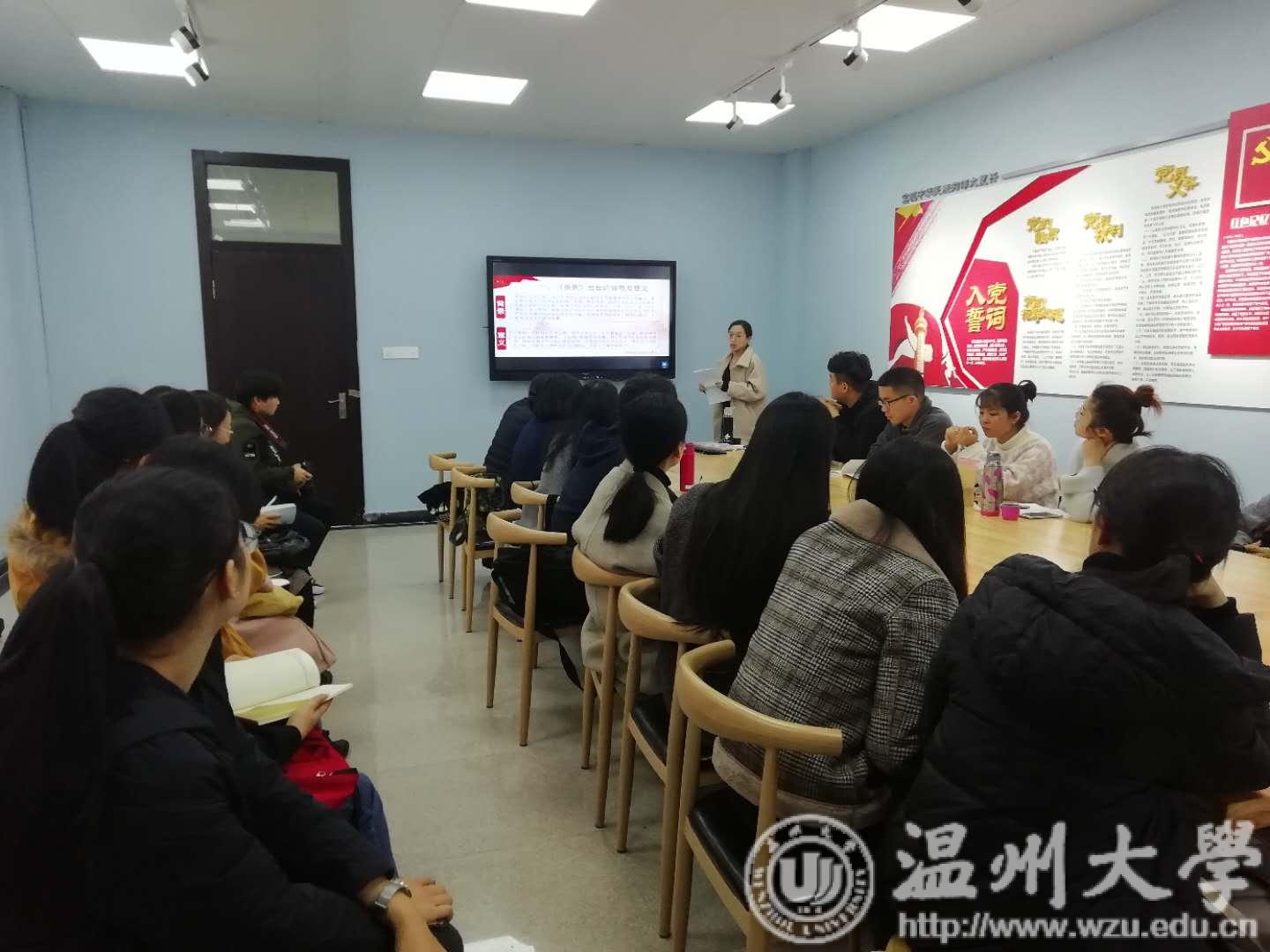 2018年12月23日下午,球探体育 学生第二党支部举行“学习《中国共产党支部工作条例(试行)》”主题党日活动。本次主题党日活动以党课的形式开展,由支部书记陈赛君进行宣讲。