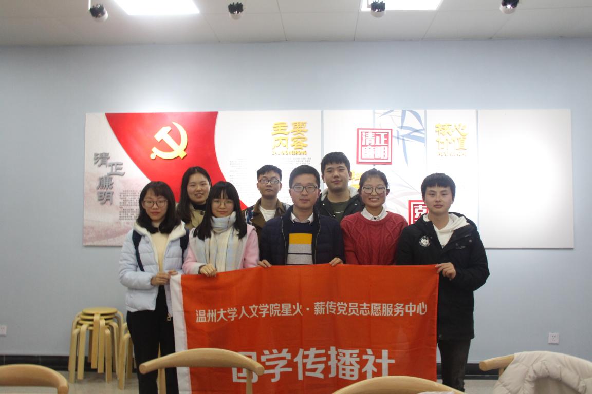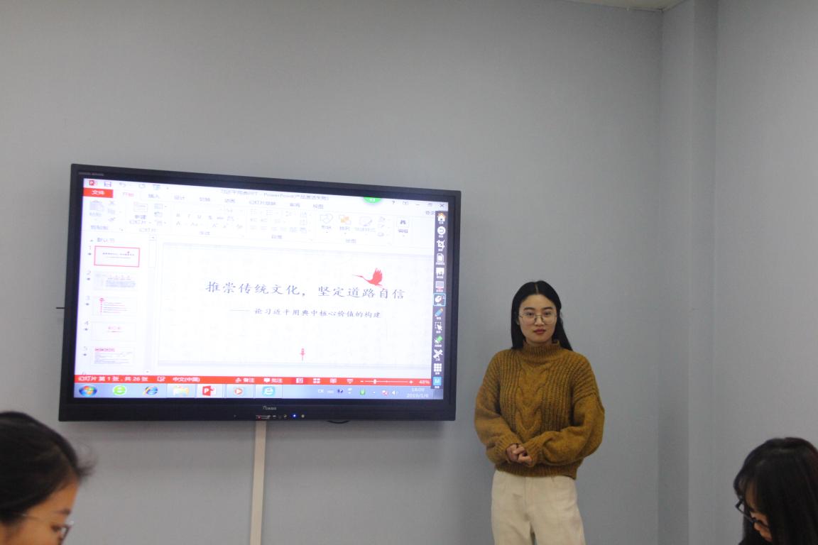 2019年1月6日晚上,球探体育 “星火·薪传”党员志愿服务中心之国学社携手学生第一党支部,于北校区外语楼221党员之家会议室举办了“推崇传统文化,坚定道路自信,习近平用典中核心价值的构建”主题宣讲活动。本次宣讲活动由国学社成员曹清清进行宣讲,由球探体育 学生第一党支部书记李林军主持。