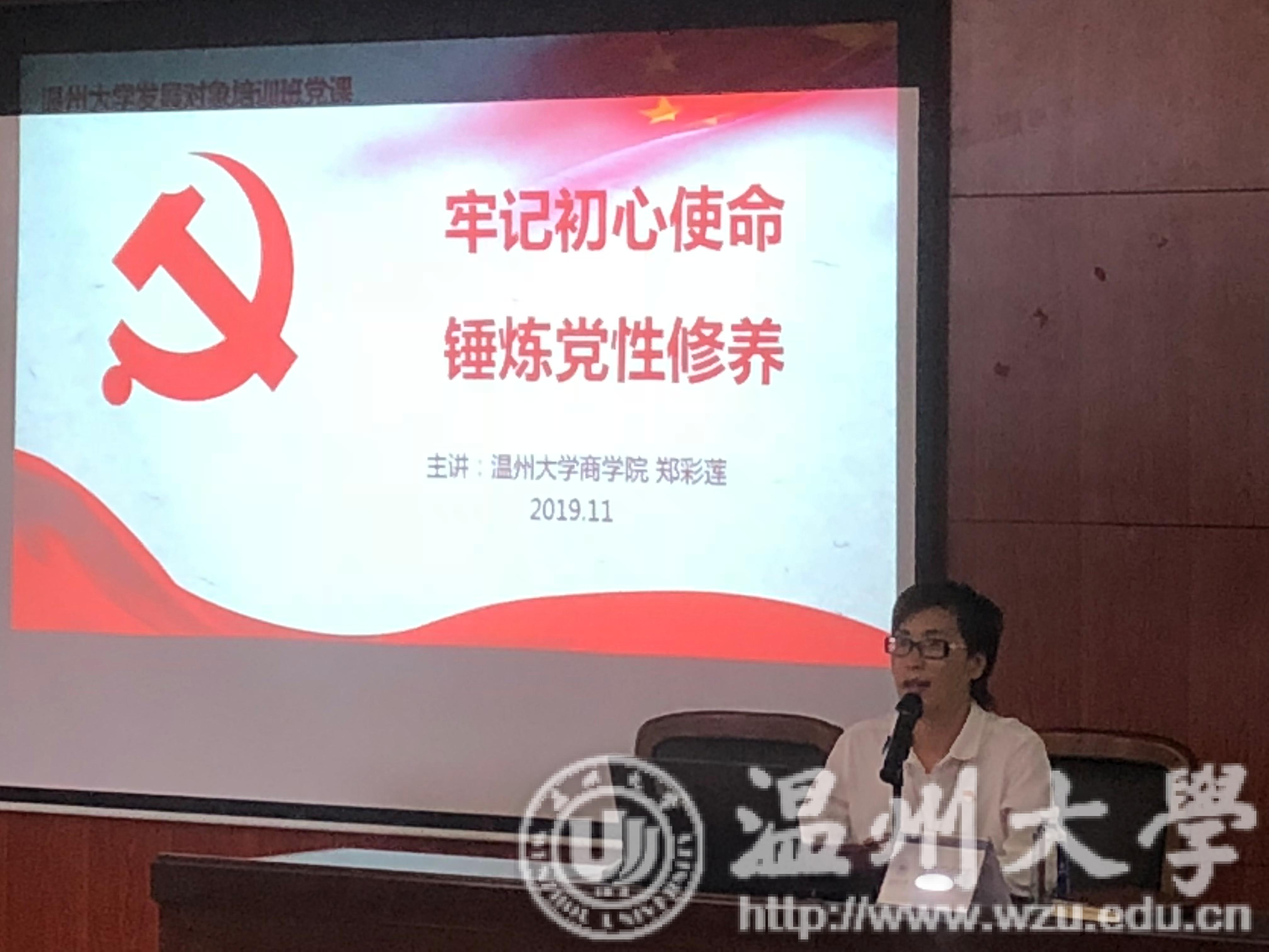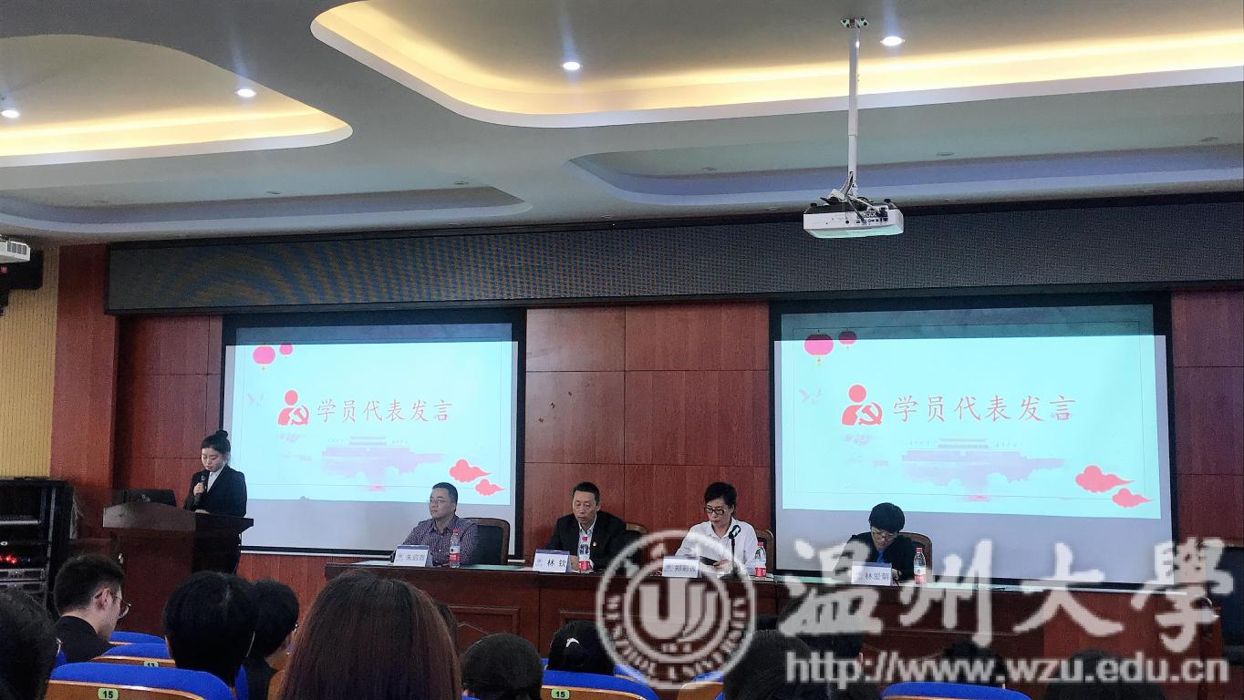 2019年11月6日下午,中共温州大学委员会党校分党校(联合)2019年第2期发展对象培训班于北校3号楼203学术报告厅正式开班。出席开班典礼的领导有:法学院党委书记林钦、商学院党委书记郑彩莲、音乐学院党委书记朱启鑫和国际教育学院党委书记林爱菊。典礼分为四个部分:奏唱国歌、商学院党委书记郑彩莲老师致辞、宣读《学员守则》、学员代表发言。