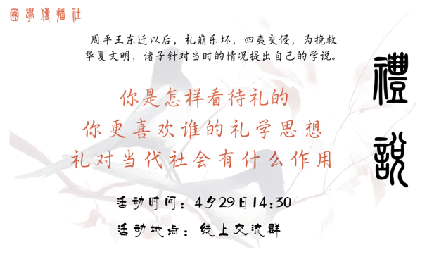 中华民族文化源远流长,“礼”为其中一枚文化符号,是华夏民族鲜明的特征。中国自古被称为“衣冠上国,礼义之邦”。而春秋战国,礼乐崩坏,四夷交侵,诸子百家各自提出自己的理论学说。为探究先秦诸子对礼的观点以及礼对当代社会的意义,2020年4月29日下午14:30,国学传播社在2019级国学传播社线上交流群举办了“礼说”活动。