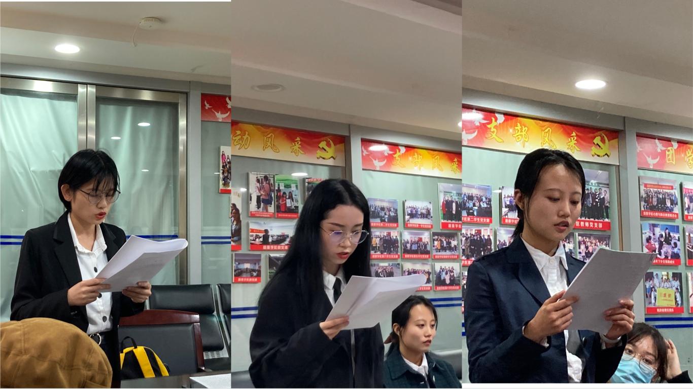 在支部书记李扬帆同志宣读会议纪律和介绍各位发展对象的发展流程后,大会正式开始。首先,由林漫珊同志、佟梓璇同志、李林霞同志分别向党组织进行汇报,各位发展对象就入党动机,个人经历,家庭主要成员情况及向党组织汇报的问题等方面认真诚恳地汇报了自身情况,并由对应的入党介绍人填写发展意见进行记录,各位与会党员及预备党员在认真聆听了各位发展对象的汇报后也对三位发展对象的情况有了基本了解。
