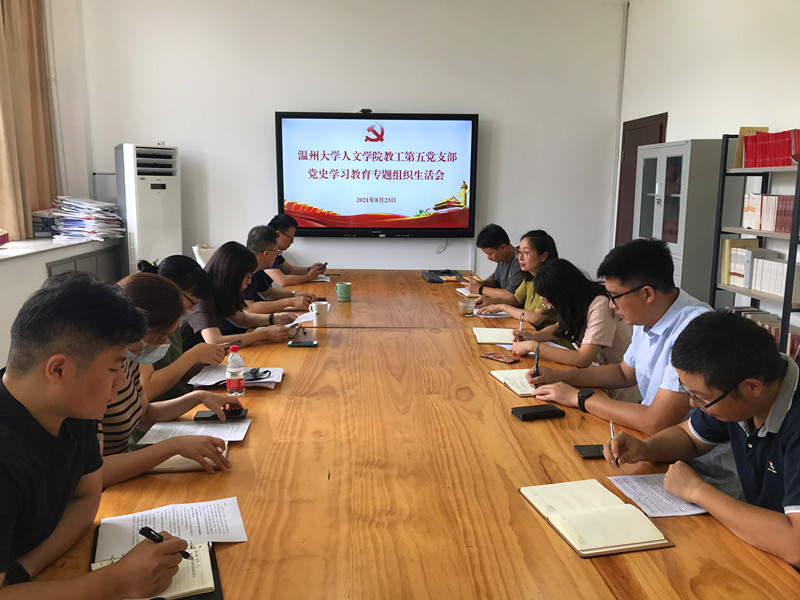 根据学校党史学习教育相关要求,围绕“学党史、悟思想、办实事、开新局”的主题,2021年8月23日上午,球探体育 教工第五党支部在人文楼党员之家召开了党史学习教育专题组织生活会,支部党员交流学习体会,剖析自身问题,查找差距不足。