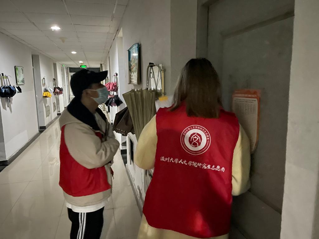 活动伊始,党员志愿者们身着红色马甲,纷纷前往自己负责的楼层。他们一一对照在校学生的名单,尤其是对于寝室人员夜不归宿的情况作了详细的记录和反馈。