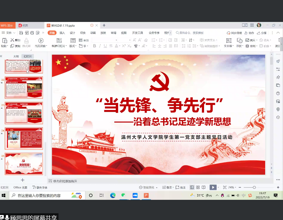 2022年7月19日,球探体育 学生第一党支部依托在线会议平台,在线上召开了“当先锋、争先行”主题党日活动,深入学习《干在实处 勇立潮头——习近平浙江足迹》。本次党日活动由学生第一党支部书记黄莹主持。