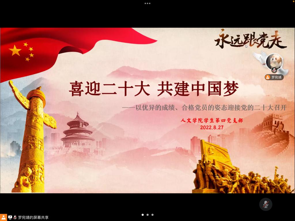 2022年8月27日19:00,为督促各位同志以合格党员的要求武装自身头脑,用合格党员的标准约束自身行为,坚定信心,勇往直前,以优异的成绩和昂扬的姿态迎接党的二十大胜利召开,球探体育 学生第四党支部于线上开展了“喜迎二十大,共建中国梦”主题党课暨学习会。本次活动由罗宛靖同志主持,共有40名同志参加。