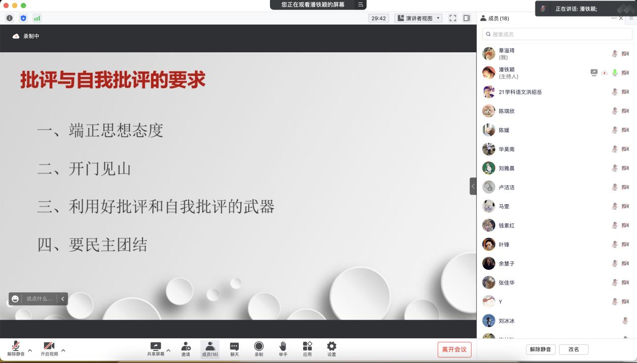 会议第二项,开展党员自评及互评。在开展自评及互评前,潘铁颖同志强调了开展民主评议会,进行自我评议与民主评议的重要性,并提出了党员自评及互评的四项要求:首先,要端正思想态度;其次,要开门见山;第三,要利用好批评和自我批评武器;第四,要民主团结。批评与自我批评是我党的优良传统。只有通过认真的自我剖析,结合他人的指正,才能逐步地认识自我,正确看待自我,才能意识到自己的不足并不断改正,得到进步。