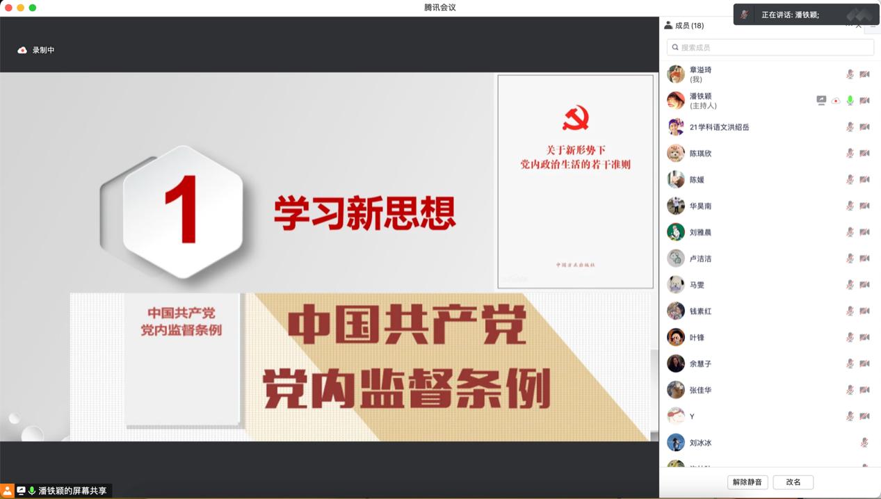 会议第一项,由潘铁颖同志带领全体党支部成员以文件和视频的形式学习《关于新形势下党内政治生活的若干准则》《中国共产党党内监督条例》。潘铁颖同志指出,要进一步加强和规范党内政治生活,更加自觉地遵守党的政治规矩和政治纪律。