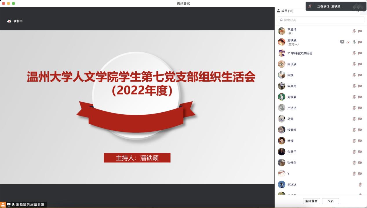 为全面贯彻习近平新时代中国特色社会主义思想,深刻领悟“两个确立”的决定性意义,增强“四个意识”,坚定“四个自信”,做好“两个维护”,以奋发有为的精神贯穿落实党的二十大所做的重大部署决议,2023年1月9日温州大学球探体育 学生第七党支部召开线上组织生活会暨2022年度民主评议大会,会议由支部书记潘铁颖主持。