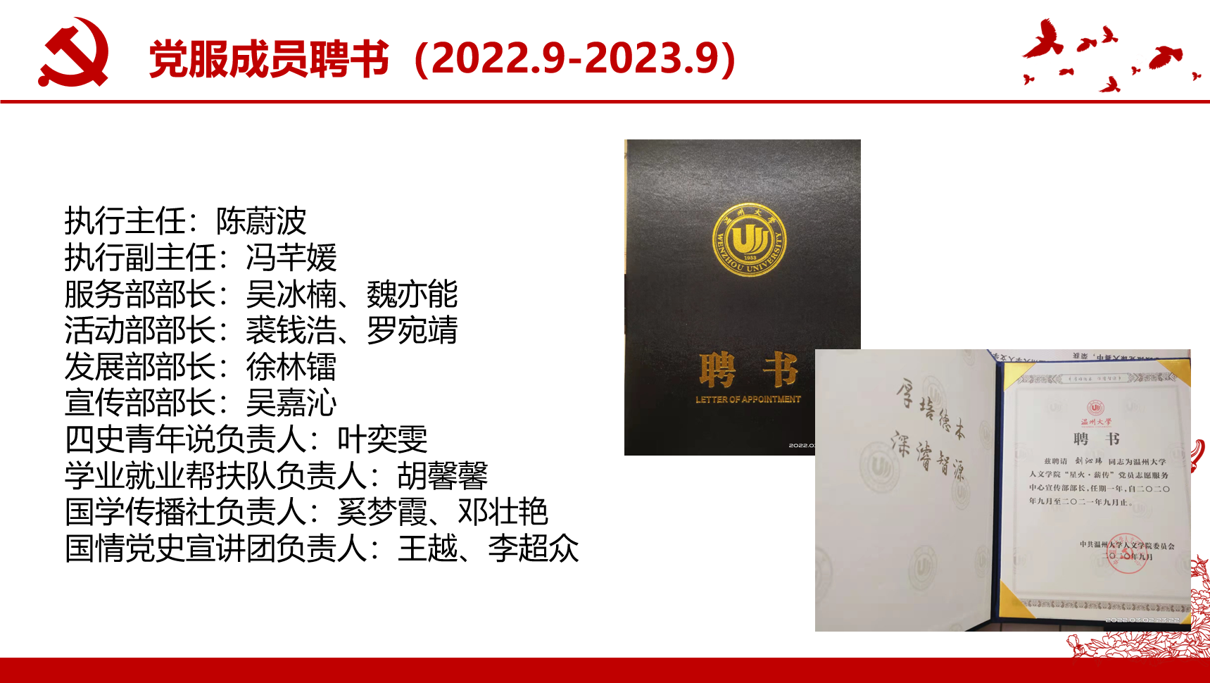 发展部部长徐林镭从两个方面进行工作总结。首先是2022-2023学年第一学期的工作概况,徐林镭按照时间顺序梳理了党组织关系转接、收集党章考试名单、召开党服内部推优大会、年终党建数据统计等相关工作;其次是2022-2023学年第二学期的工作规划,徐林镭将每个月的工作罗列,为接下来更好地开展工作指明了方向。