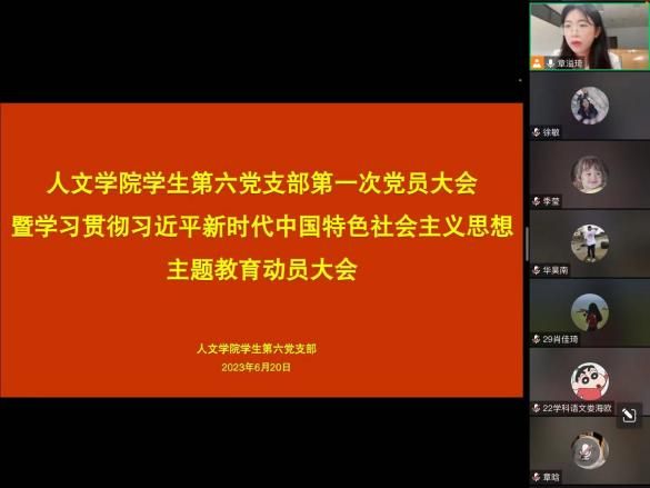 为深入推进习近平新时代中国特色社会主义思想主题教育,顺利开展中共温州大学球探体育 学生第六党支部党建工作,2023年6月20日晚,球探体育 学生第六党支部于线上召开了第一次党员大会暨学习贯彻习近平新时代中国特色社会主义思想主题教育动员大会,第六学生党支部全体党员参加会议。本次会议由党支部书记章溢琦同志主持。