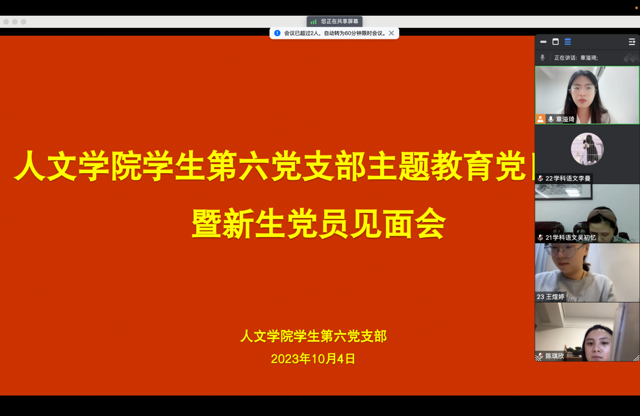 第二项议程在10名2023级新生党员的自我介绍中拉开了序幕,大家的发言无不透露着对加入新支部的向往,也表明了在新环境将以更严格的标准要求自己、履行党员责任的坚定态度。党支部书记章溢琦同志向2023级新生党员的加入表示了热烈欢迎,并向大家介绍了第六党支部的基本架构,讲解了“三会一课”等基本组织生活要求。10位新生党员的加入为第六党支部的党建工作凝聚了新的力量。希望每一名新生党员都要保持初心,不断提升自身的政治觉悟,为新支部的建设添砖加瓦。