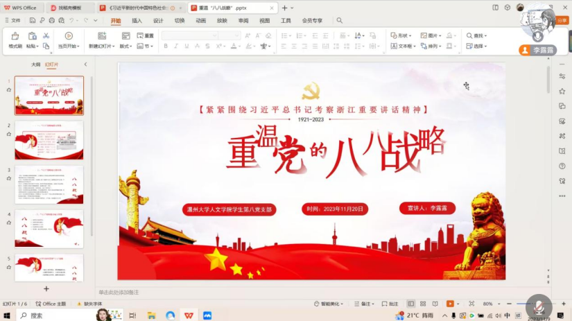党支部书记李露露同志带领支部全体党员共同学习了习近平总书记考察浙江重要讲话精神,共同学习领悟习近平总书记对浙江大地的倾情牵挂、对浙江工作的高度重视、对浙江人民的关心关怀;认真学习习近平总书记作出的“八八战略”之于浙江的极端重要性,以及在“八八战略”指引下浙江、温州发生的精彩蝶变,同时也深刻体悟到习近平总书记对浙江发展的战略定位、精准点题的重要意义,以及温州全面对标对表习近平总书记重要讲话精神,为全国全省发展大局贡献温州力量的使命担当。