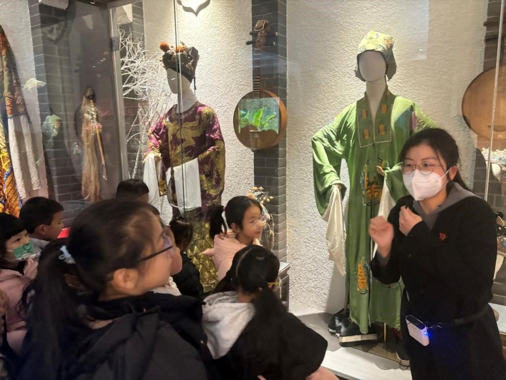 康楠同志首先带领孩子们来到第一个展厅,欣赏戏曲演员们曾经上台演出用过的戏服和道具。做工精细、华丽大气的服饰一下子吸引了小朋友们的注意,围在玻璃展示柜外仔细聆听讲解员的解说。墙上的三叉戟让“西游迷”来了兴致,连忙问讲解人员:“这是不是《西游记》里面沙僧的武器?”引得周围的孩子和家长们哈哈大笑,在欢乐中沉浸体验戏曲文化。