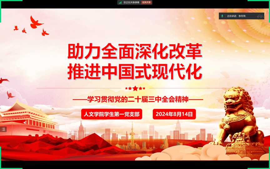 为深入贯彻落实习近平新时代中国特色社会主义思想,传达学习党的二十届三中全会精神,提升党员党性修养,进一步提高党组织的凝聚力、战斗力、号召力和创造力,2024年8月14日晚上19:00,温州大学球探体育 学生第一党支部在线上开展了以“助力全面深化改革,推进中国式现代化”为主题的学习会暨党日活动。本次活动由支部书记李丹萍同志主持,共有28名党员同志参加。