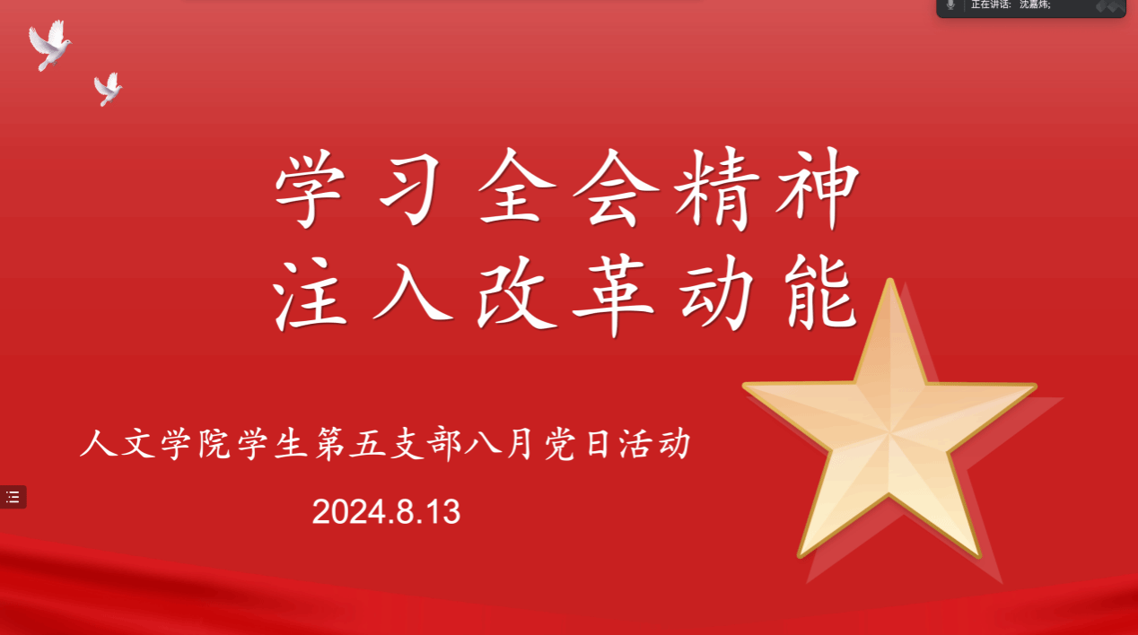 为深入学习贯彻党的二十届三中全会精神,推动全会精神深入人心、落地生根,2024年8月13日,球探体育 学生第五党支部于线上开展“深入学习贯彻党的二十届三中全会精神”主题党日活动。本次活动由沈嘉炜同志主持,共有34名同志参加。