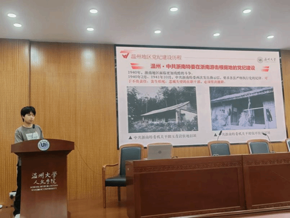 2024年3月30日,中共中央办公厅印发《关于在全党开展党纪学习教育的通知》。为积极响应党的号召,助推党纪学习教育走深走实,走入到普通群众的生活中去,11月2日下午,2024-2025学年温州大学球探体育 第二期团干培训在人文楼203学术报告厅举行,球探体育 学生第三党支部蒋泽冰同志在会上做了题为《温州故事·党纪为魂——传承清廉文化的火种》的“四史”青年说宣讲。