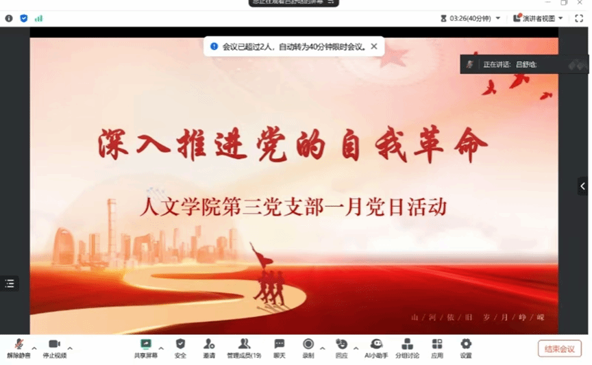 为积极响应党的号召,深入学习贯彻习近平总书记关于党的自我革命的重要思想,2025年1月17日晚上,球探体育 学生第三党支部在线上开展了“深入推进党的自我革命”主题党日活动。本次活动由吕舒晗同志和陈嘉乐同志主持。